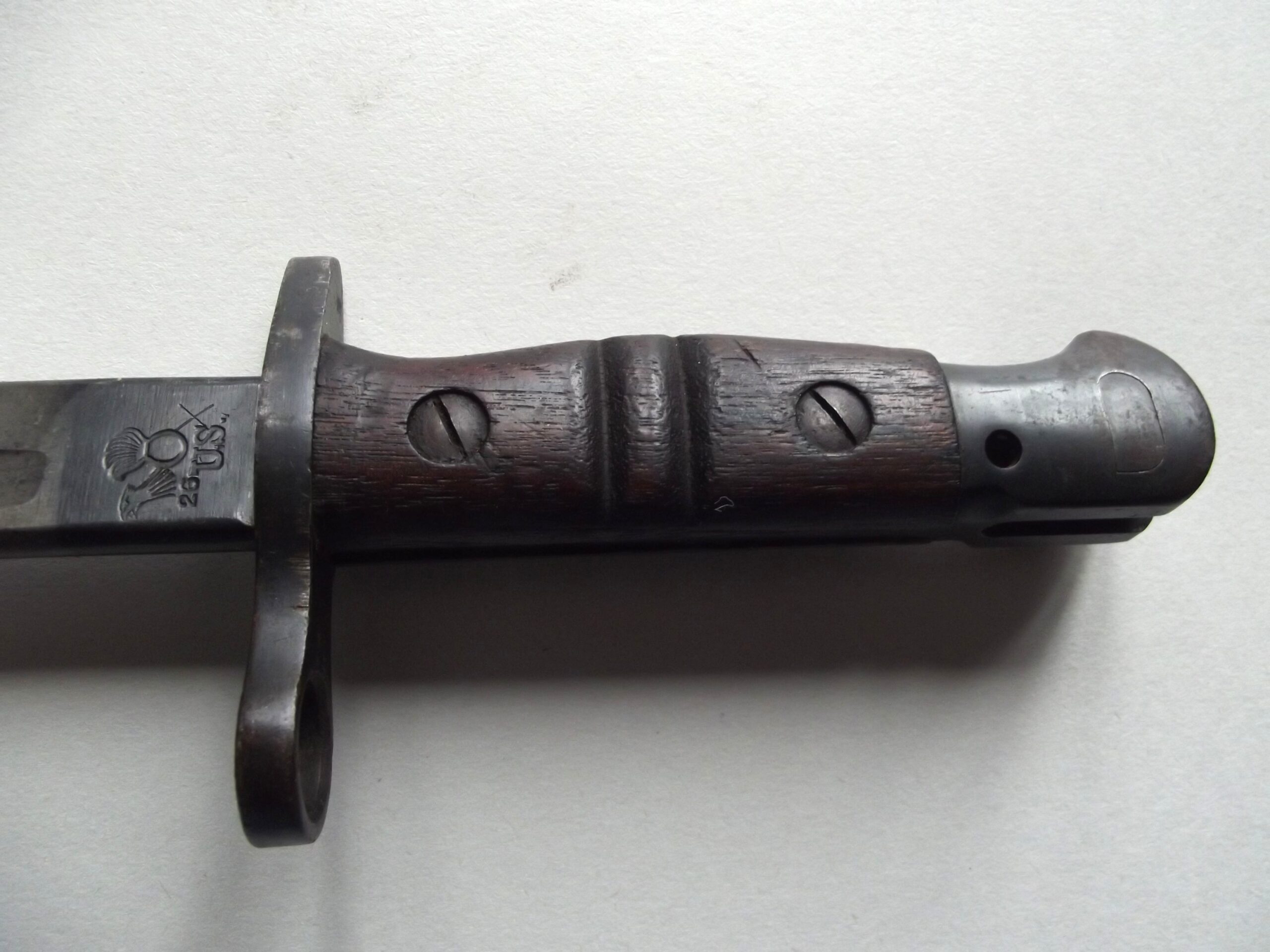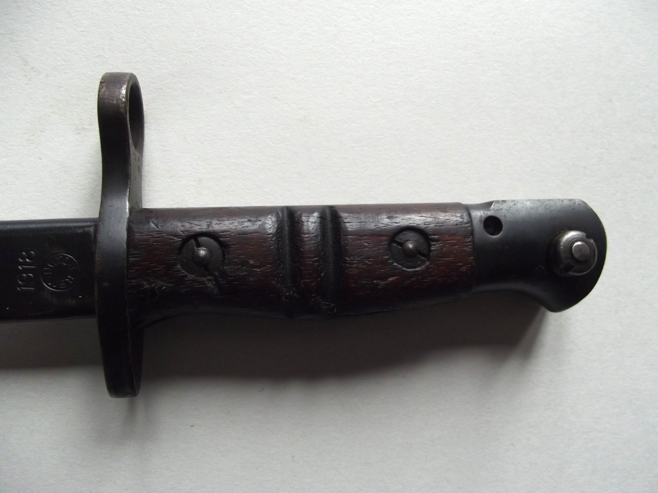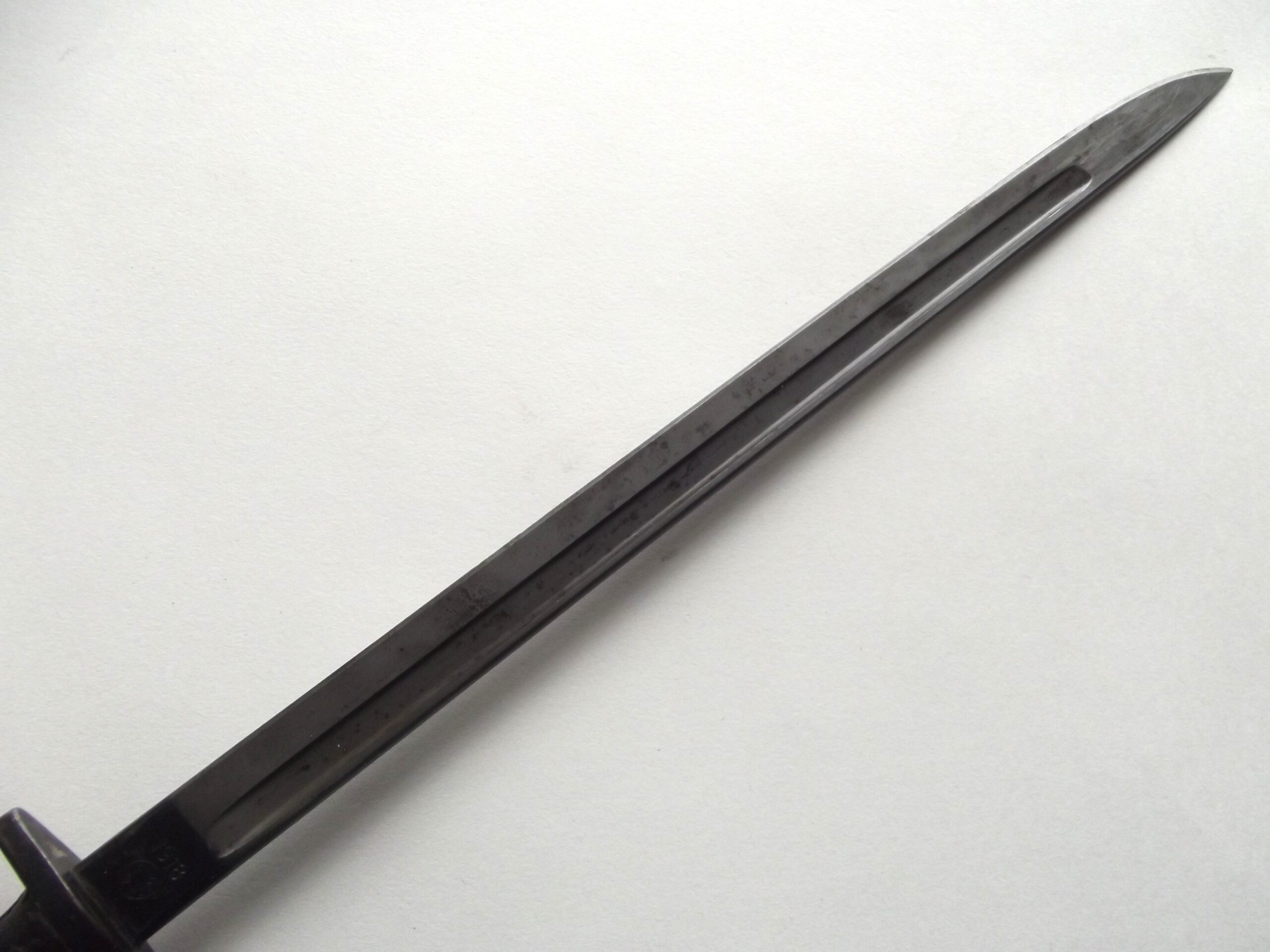 The blade of the bayonet is in good clean condition with its factory finish still intact and showing very minor age related colour. The bayonet retains its original wooden grips.