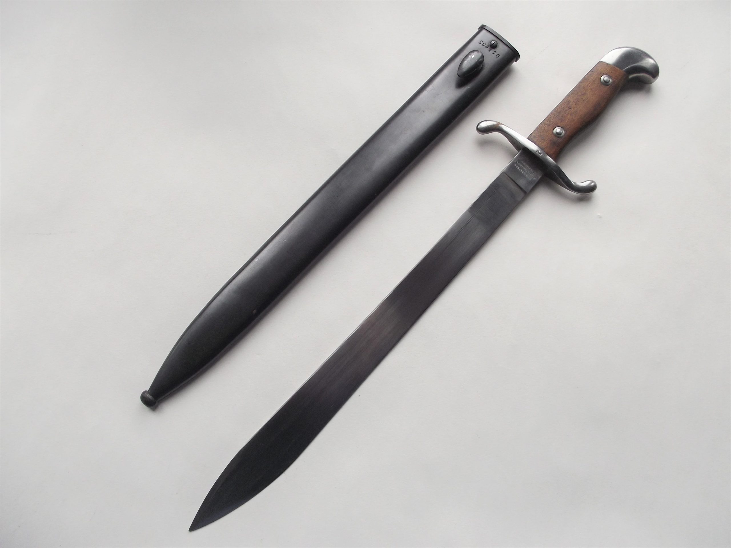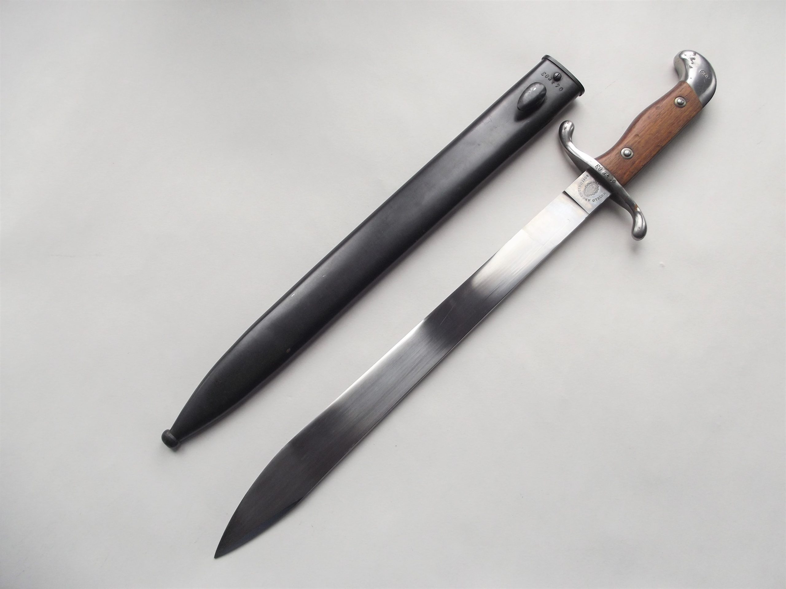 Argentine Model 1909 side arm or short sword in very good condition. The side arm and scabbard have matching number E 03470.