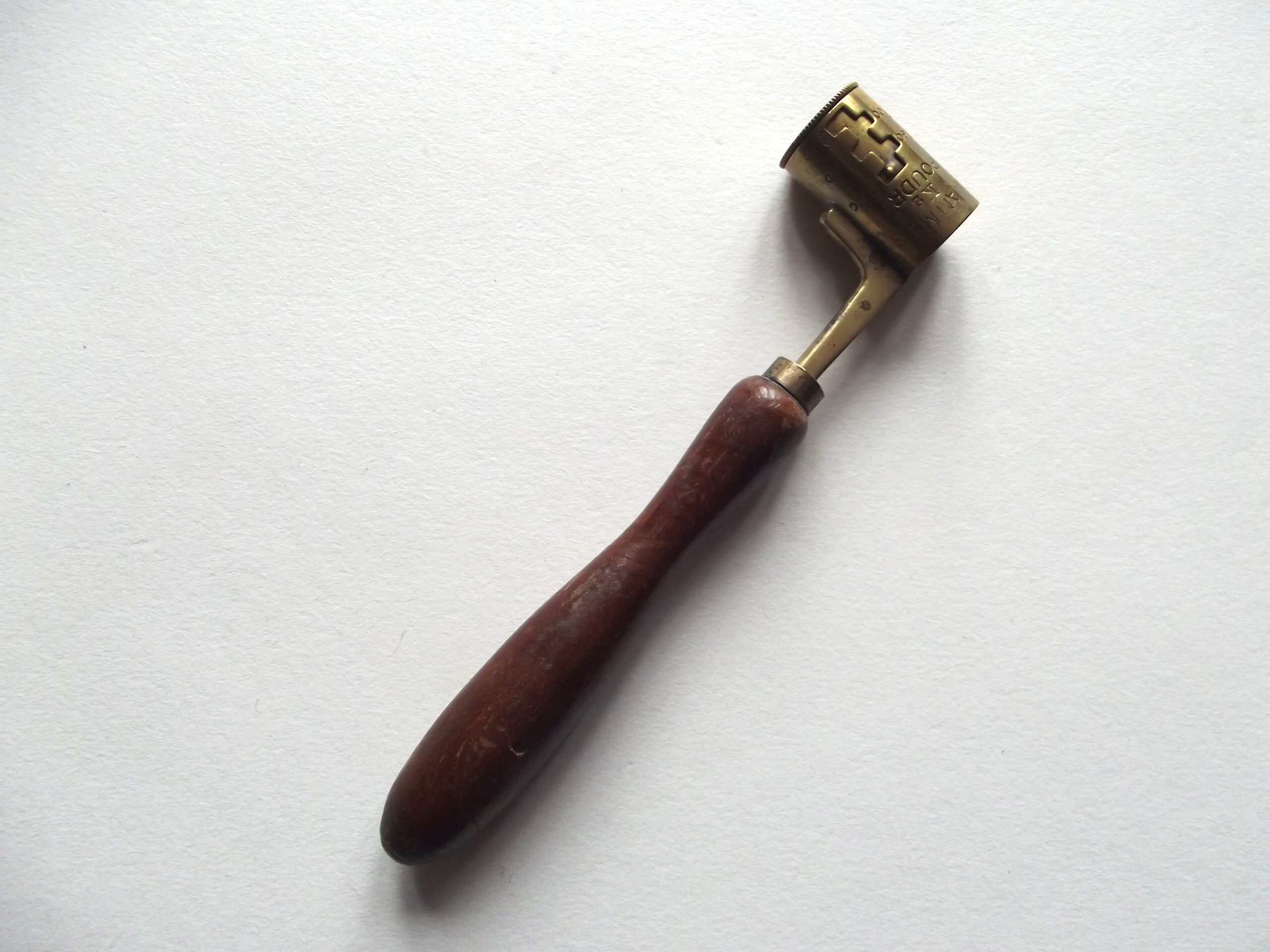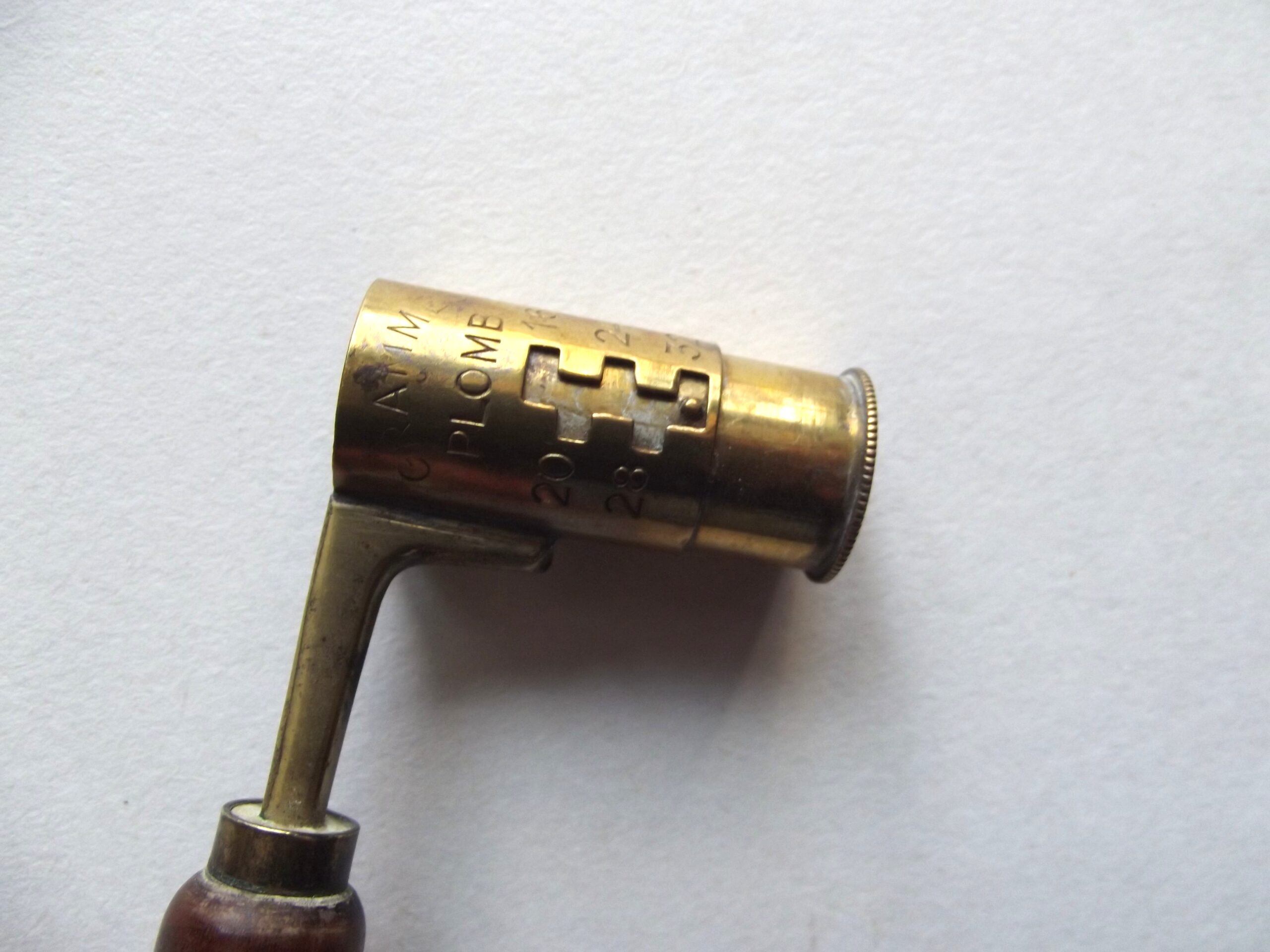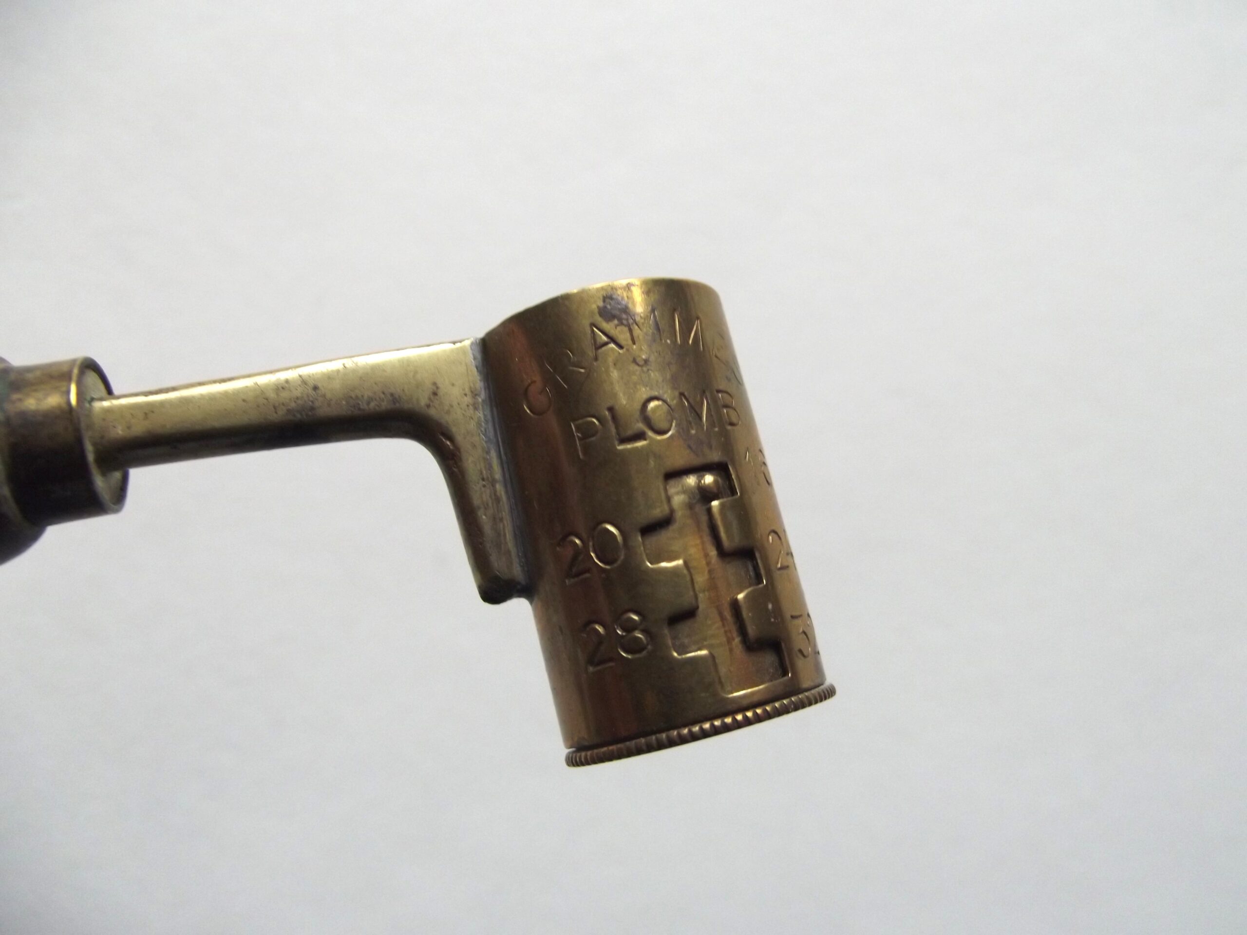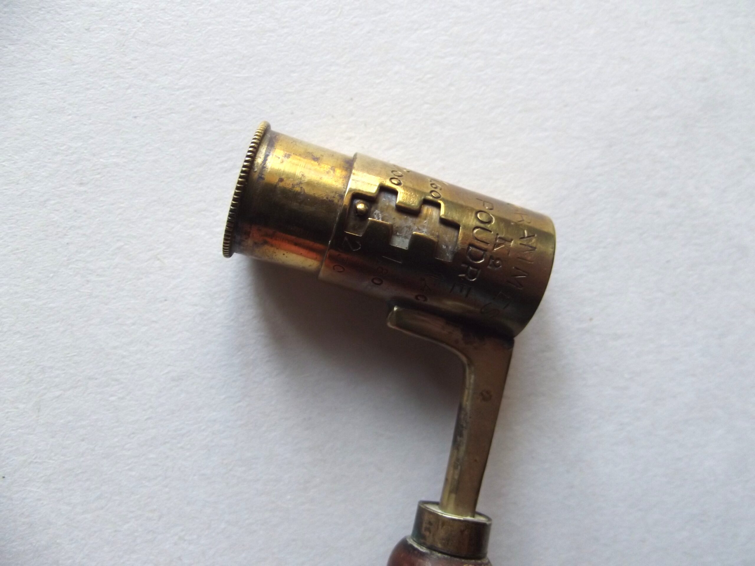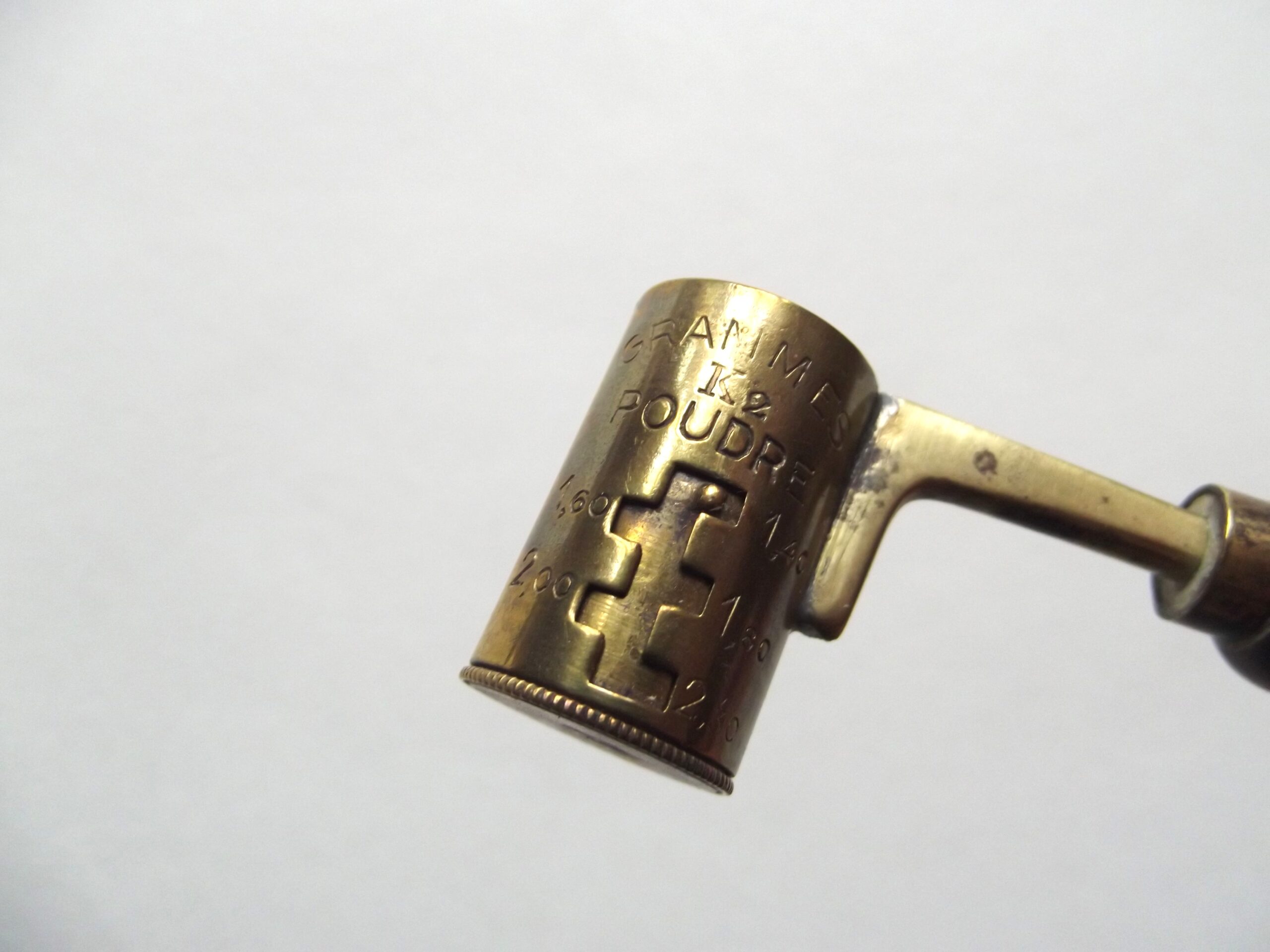 Vintage French shot and powder measure in good used condition. The measure shows 16 grams to 32 grams and 1,40 to 2,30.