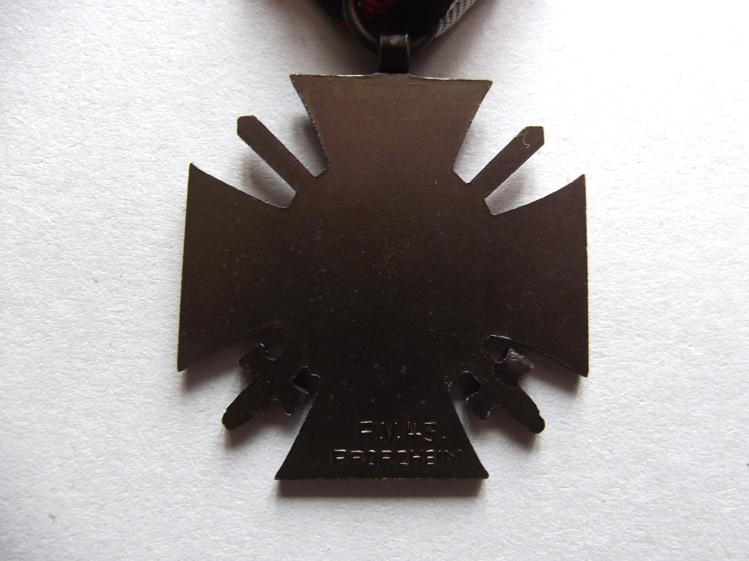 WW1 German Hindenburg cross of honour with crossed swords with its replacement ribbon in good condition. The medal is maker marked on the back of the medal R.V 43 Pforzheim.