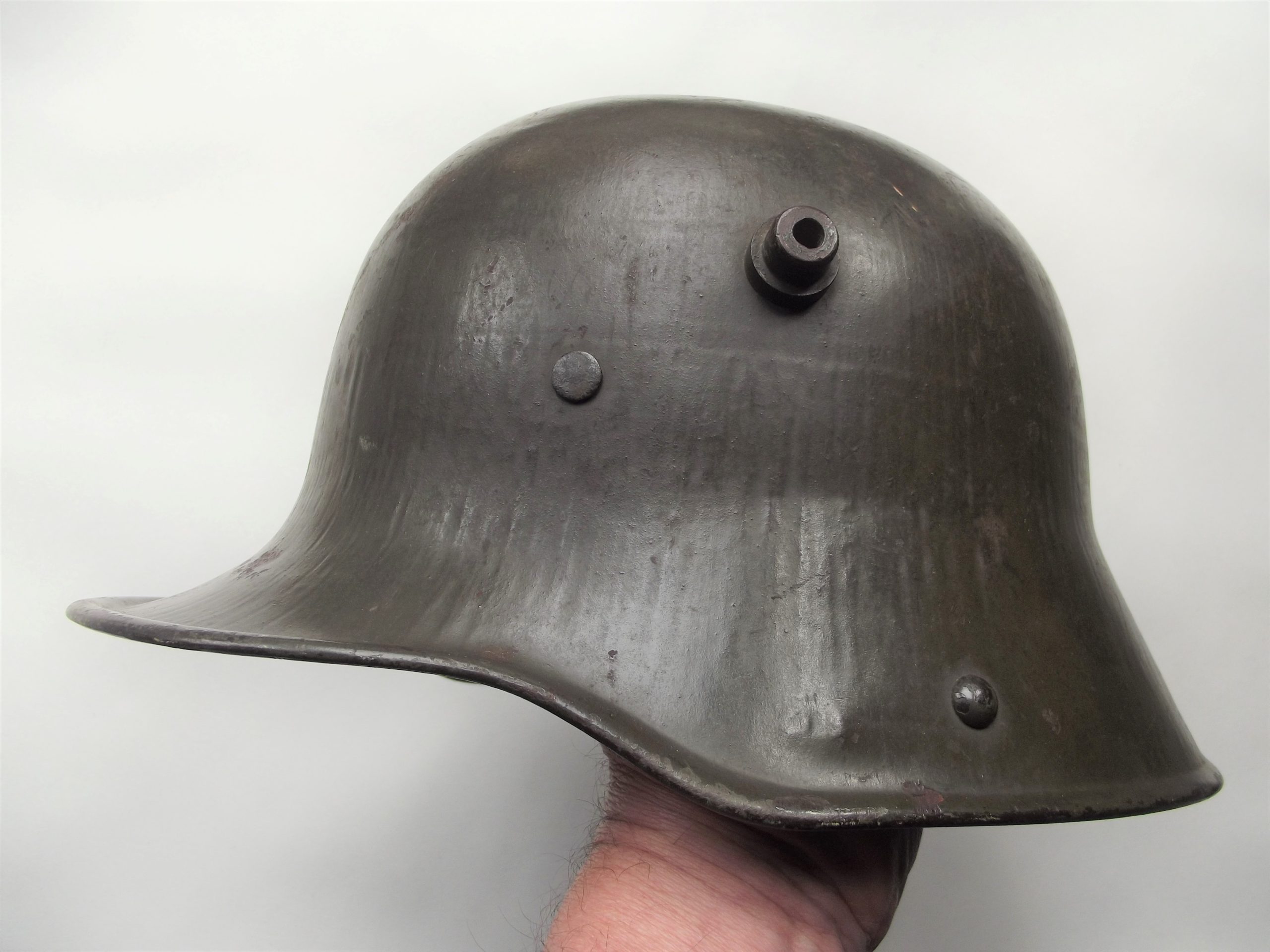 WW1 Imperial German M17 steel helmet in good used condition. The steel helmet retains its original painted factory finish it has some age related wear in places but overall s in very good condition, the steel helmet has suffered a bullet strike at the back which the blast from the bullet can be seen and has caused the back rivet to come away, this has been photographed. The steel helmet is a size 62 with a makers mark of S.I which is for Eisenhuette Silesia, Paruschowitz Oberschlesien , the helmet has its three leather pads and padding in place held by the two front rivets which are tight to the steel helmet all three leather pad are maker marked and dated 1917 this has been photographed they do show age related wear and the leather is a little dry, the size marking has been stamped and on the other side of the steel helmet as well it is a little faint ink mark but can be seen in the photographs, please see the photographs for further details.