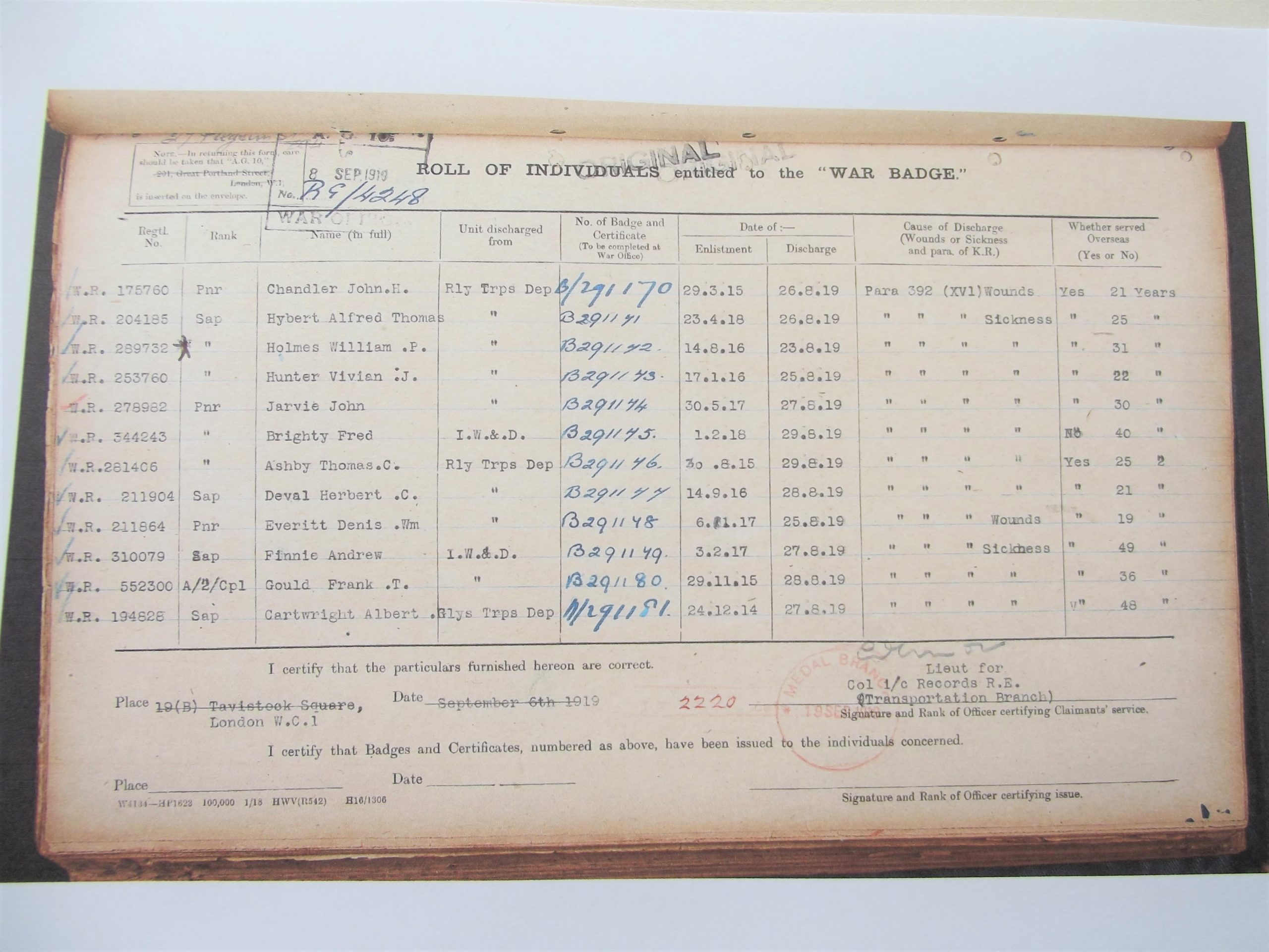 WW1 Silver war badge in good used condition. The badge is complete with its pin in place the badge was issued to William P Holmes service number W.R 289732 badge number B291172 who served in the Royal engineers he enlisted 14th August 1916 and was discharged on the 23rd August 1919.