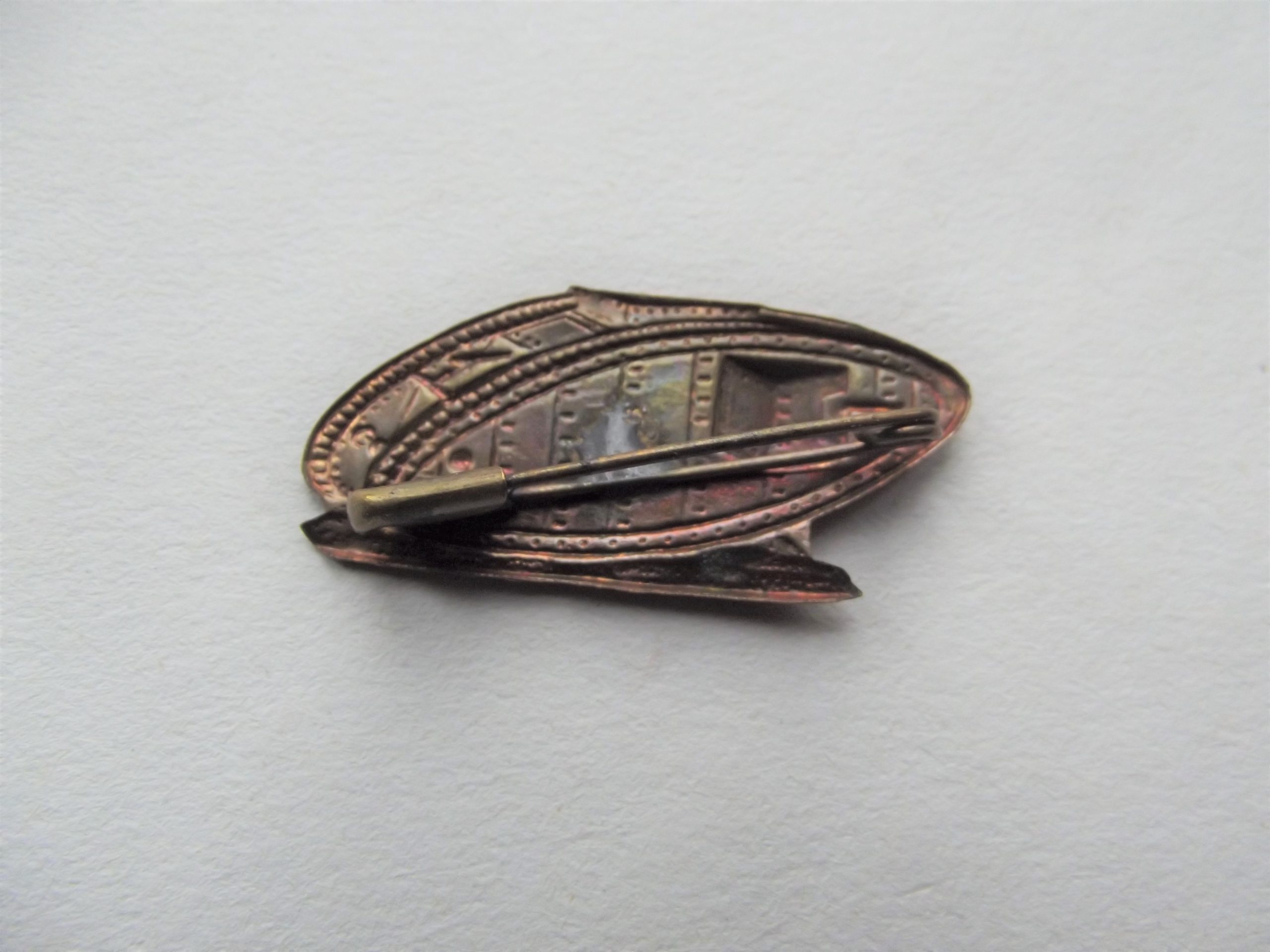 WW1 Tank corps sweetheart badge in good used condition. The badge is sheet brass pressed with good detail. The badge has its pin fitting in place and is a rarer example to find.