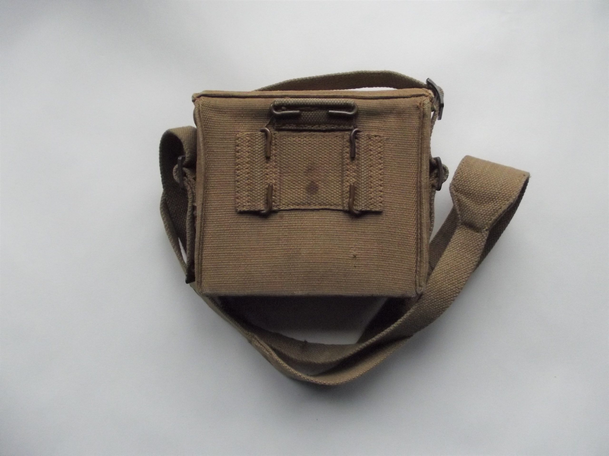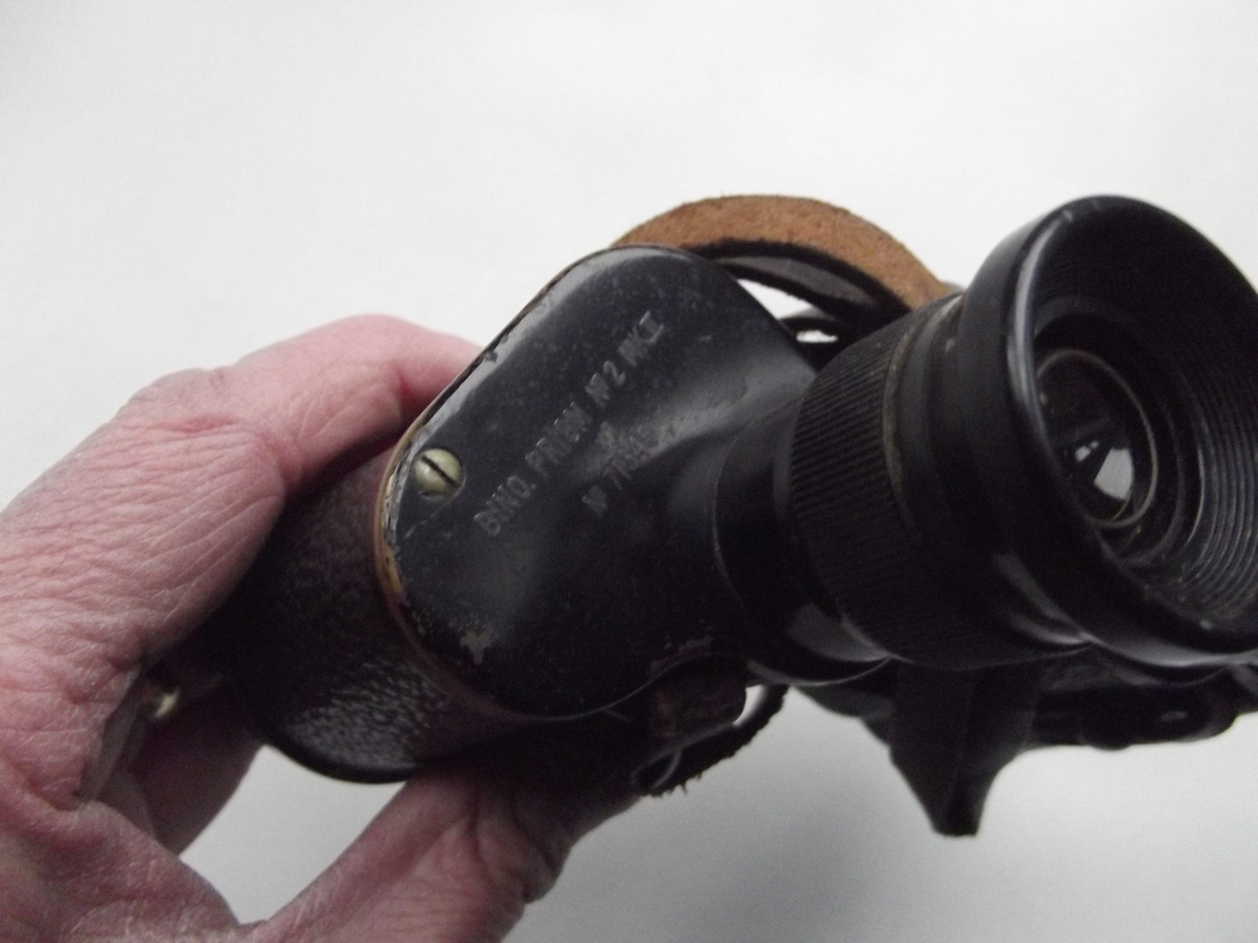 WW2 37 ptn webbing binocular case and binoculars in good used condition. The webbing case is maker marked M.W.& S Ltd Martin Wright and Sons with the war department arrow. The webbing case is in good condition with a 1941 dated shoulder strap, maker M.E.Co 1941.