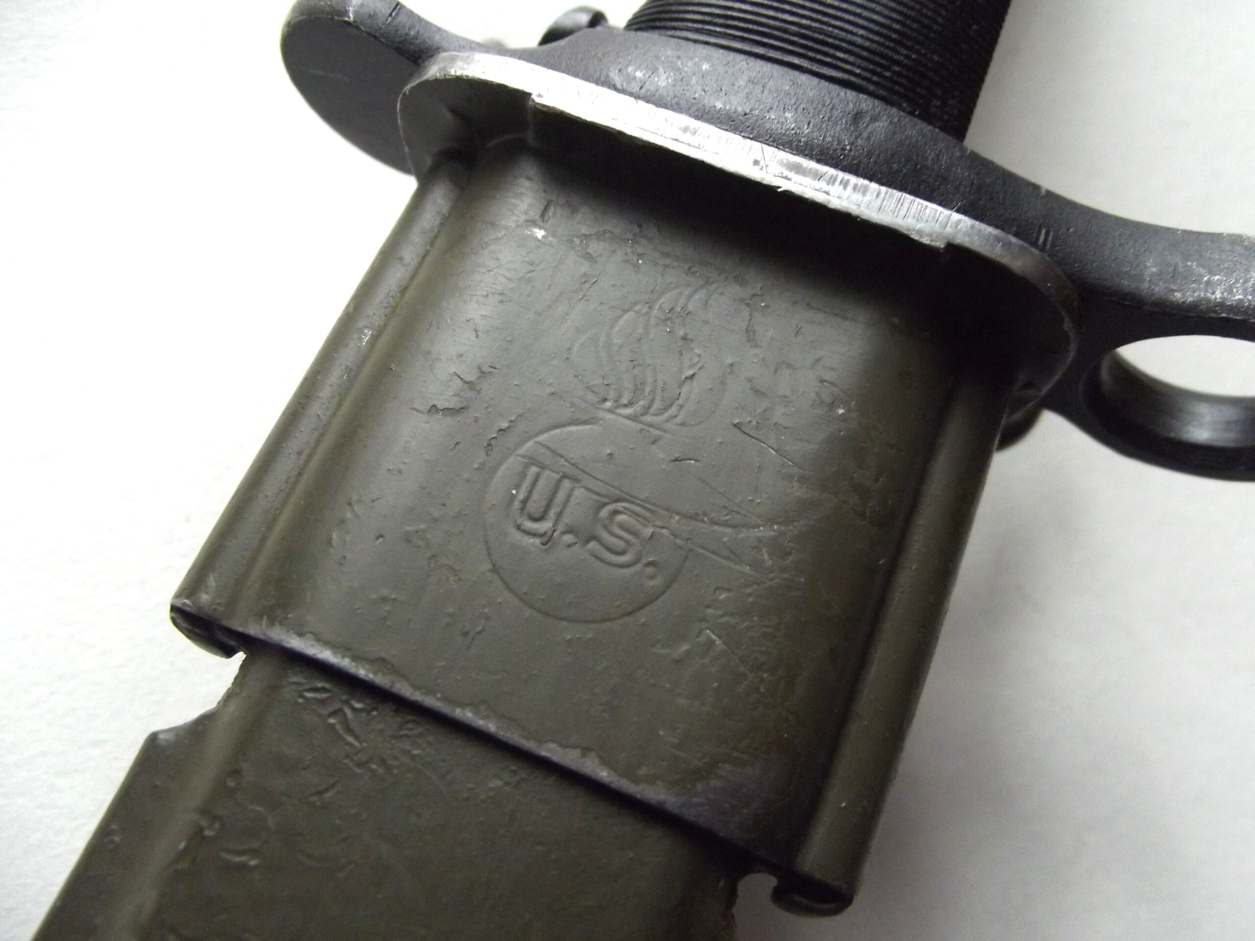 The painted scabbard has the flaming grenade with US mark on the metalwork, it shows age related wear .