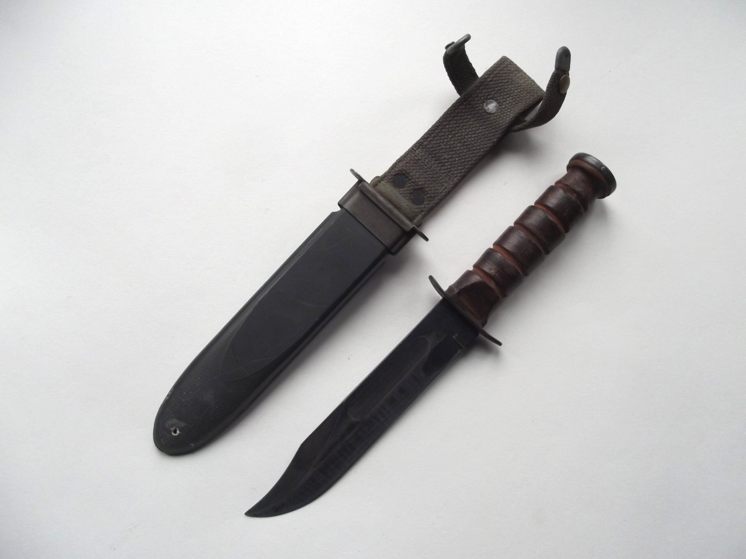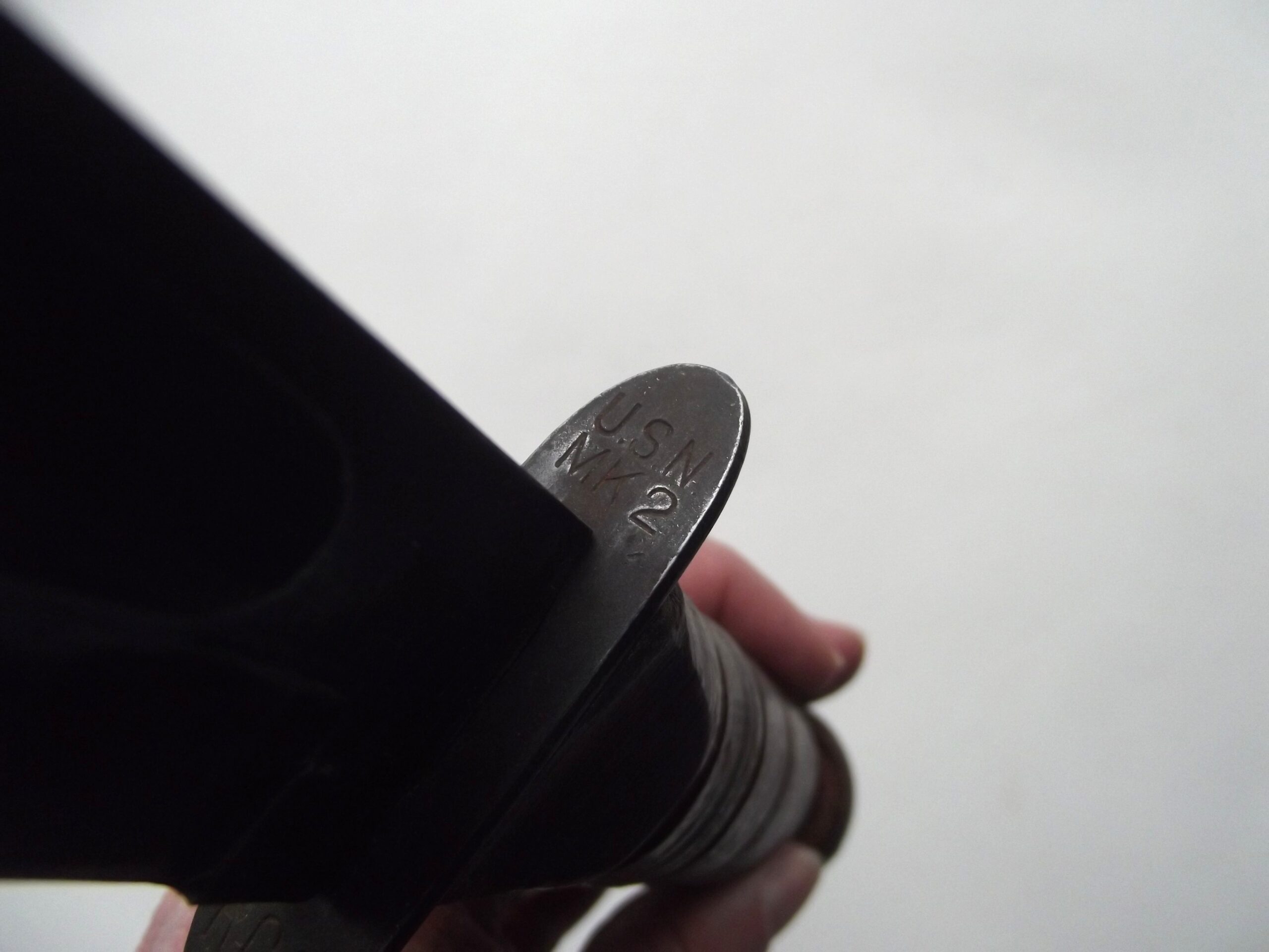 It has a fibre scabbard is marked USN MK 2 on the front. The maker mark is on the back B.M. Co.