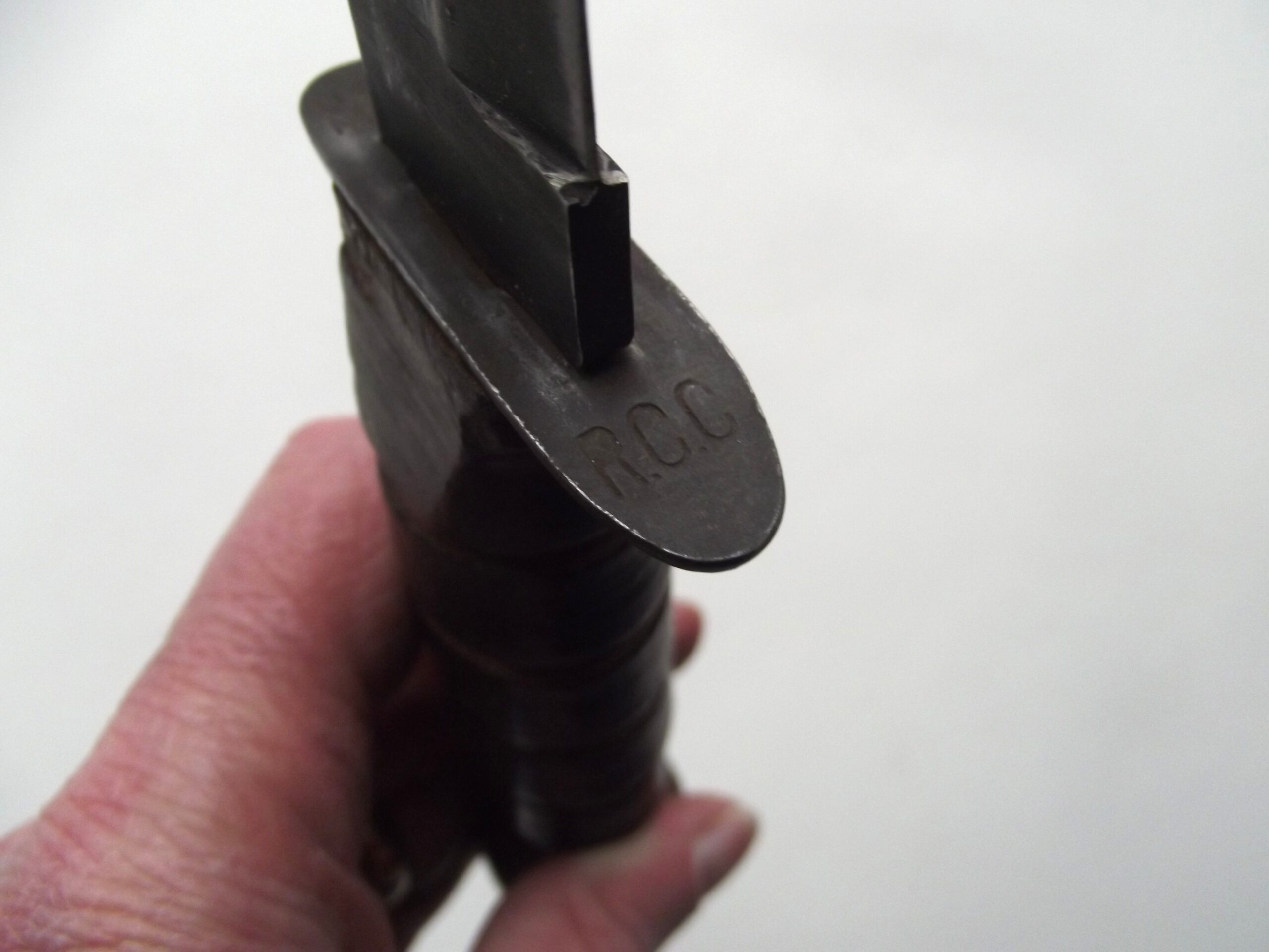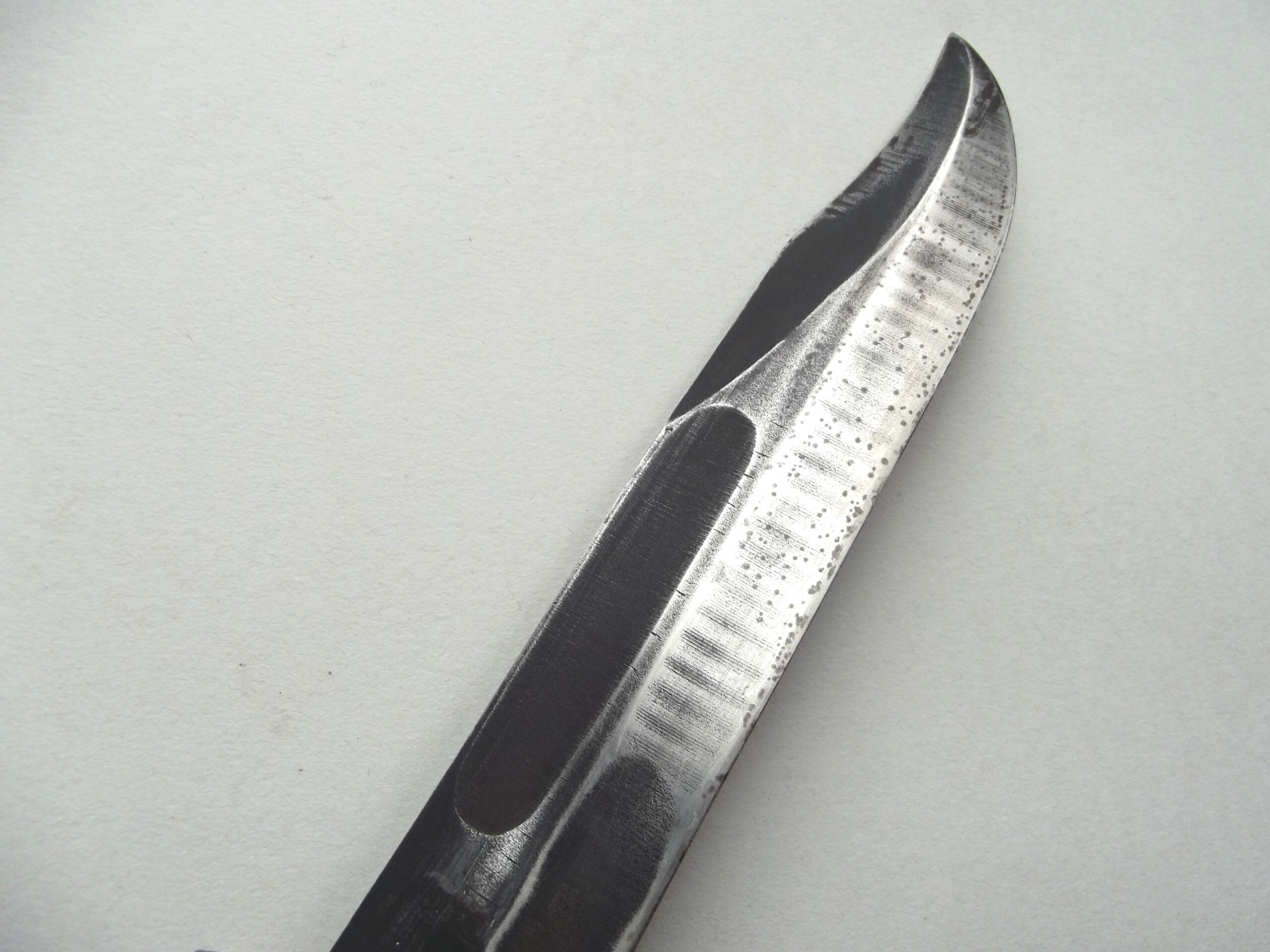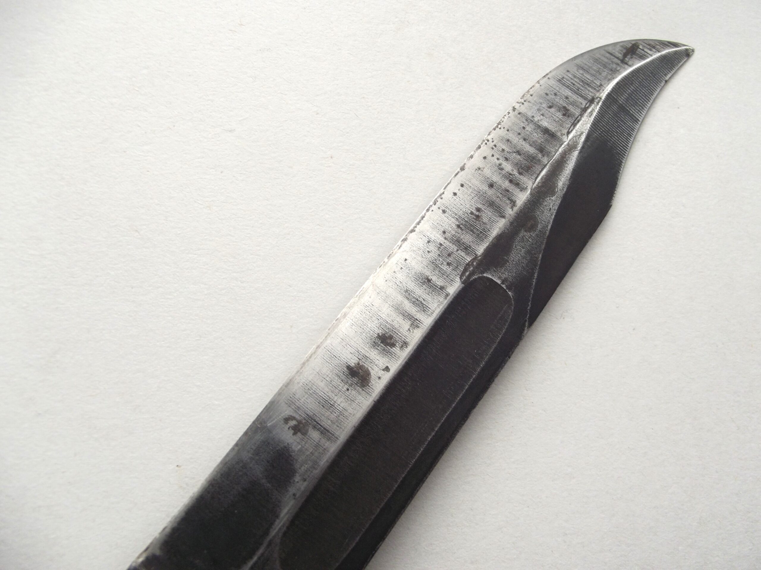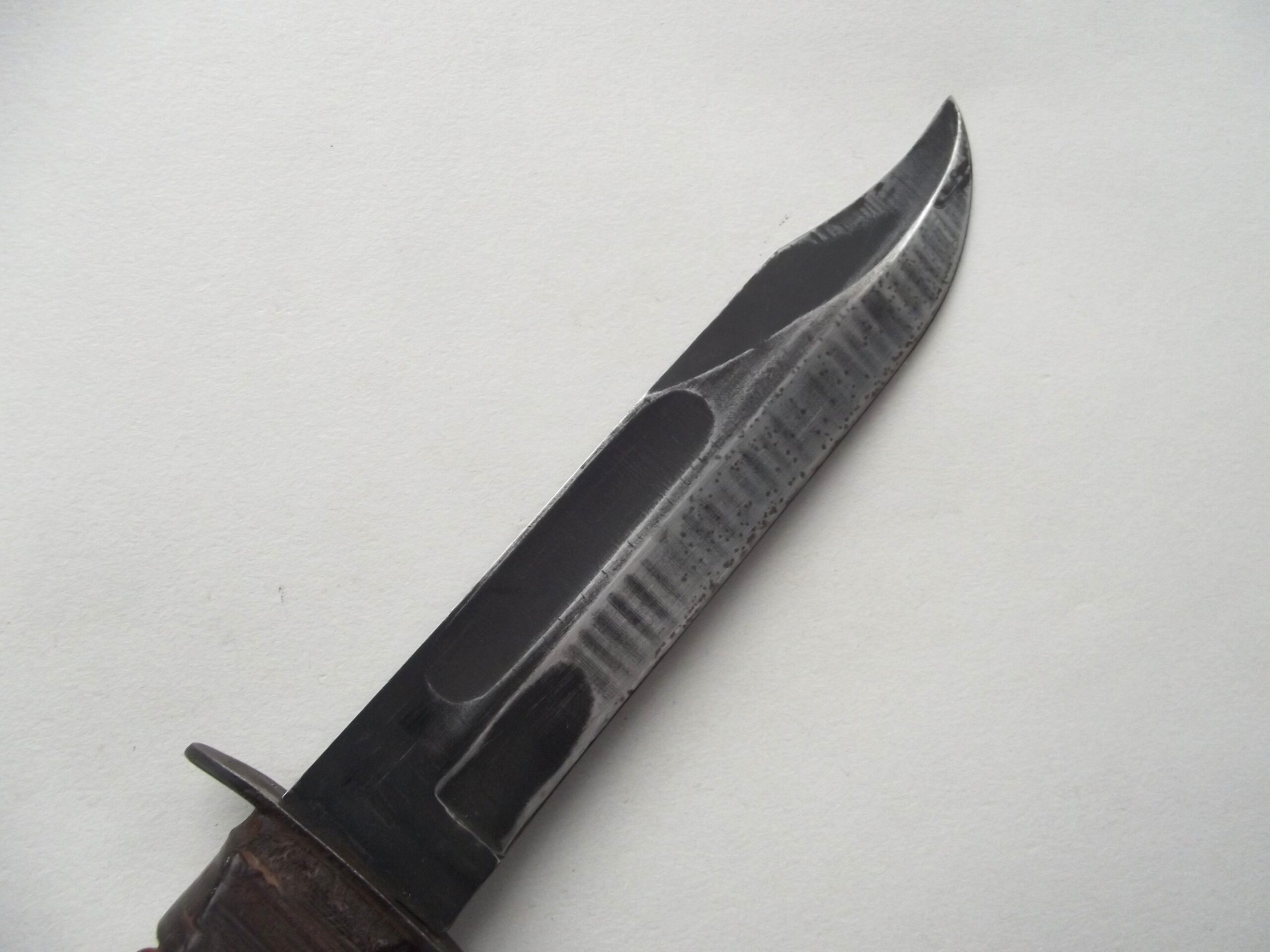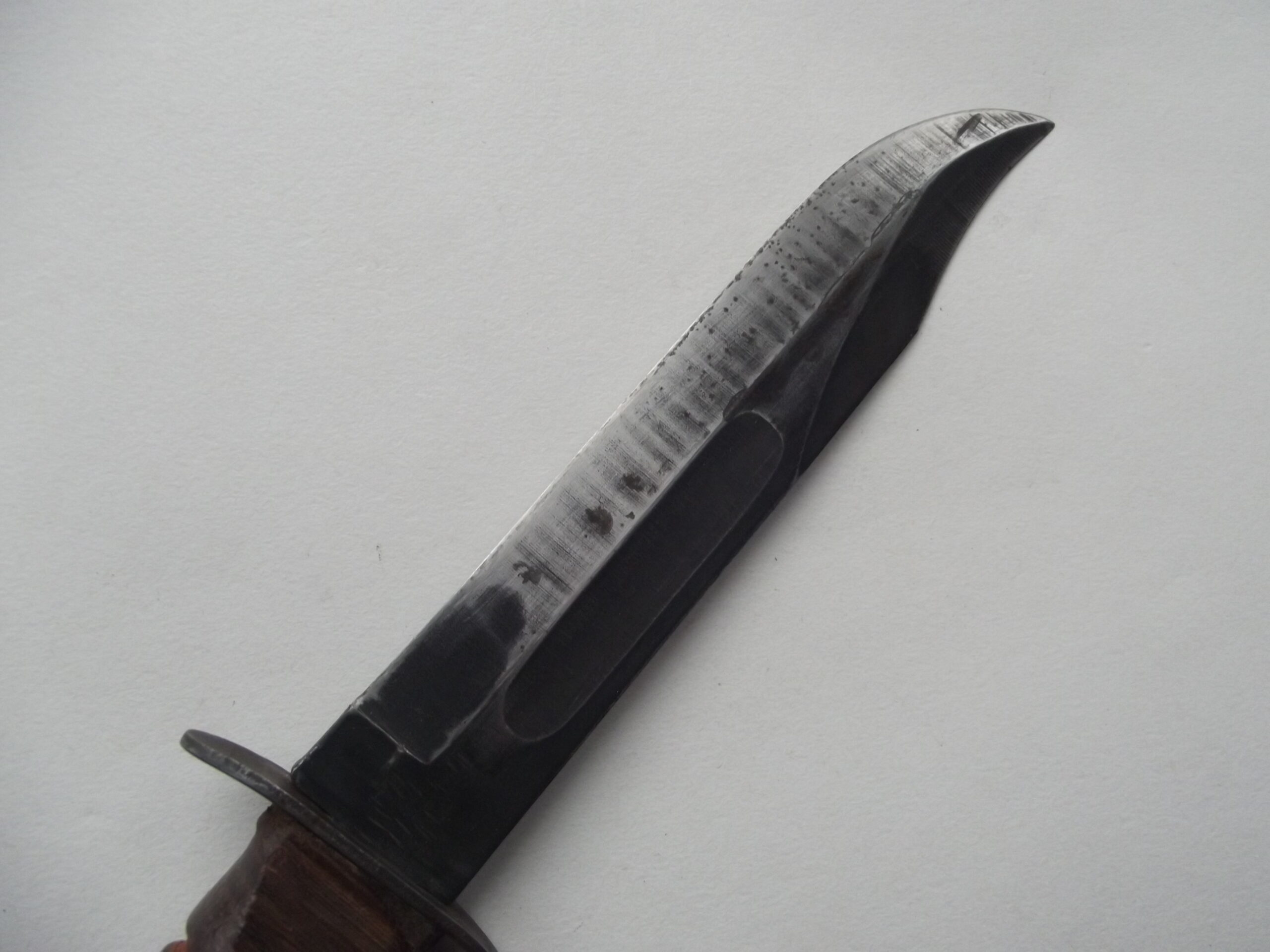 The blade of the fighting knife still has some its factory finish intact with some age related wear showing.