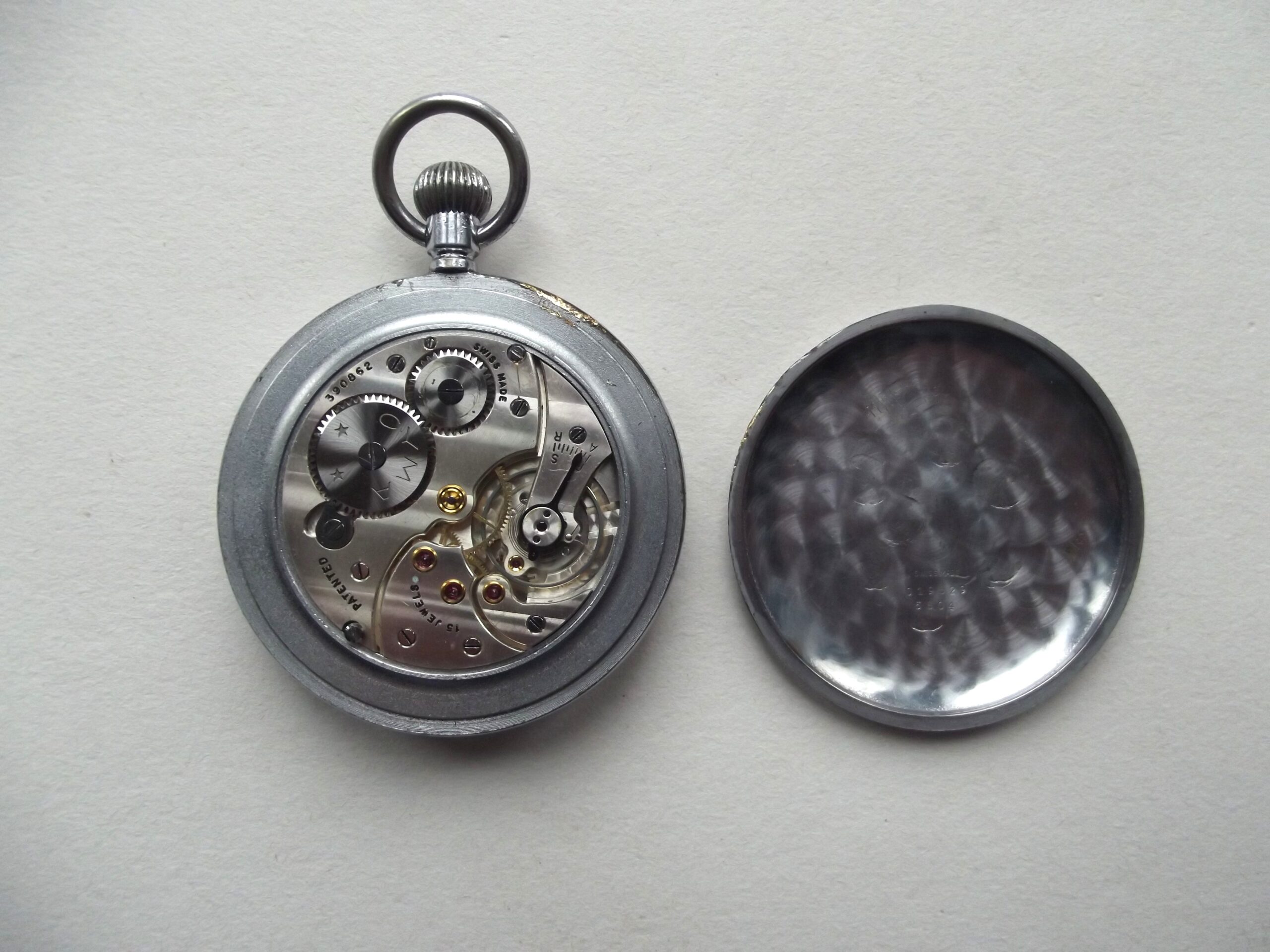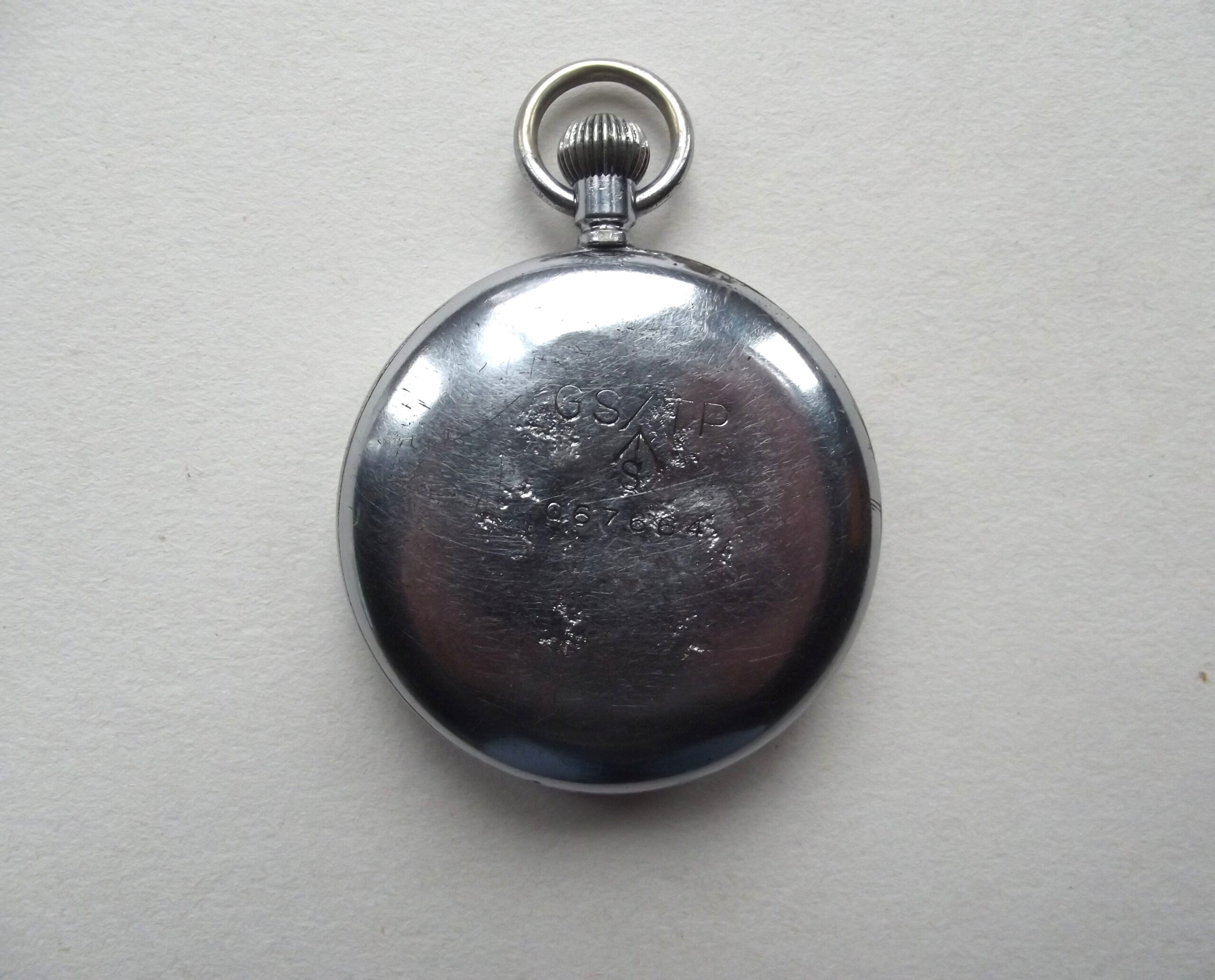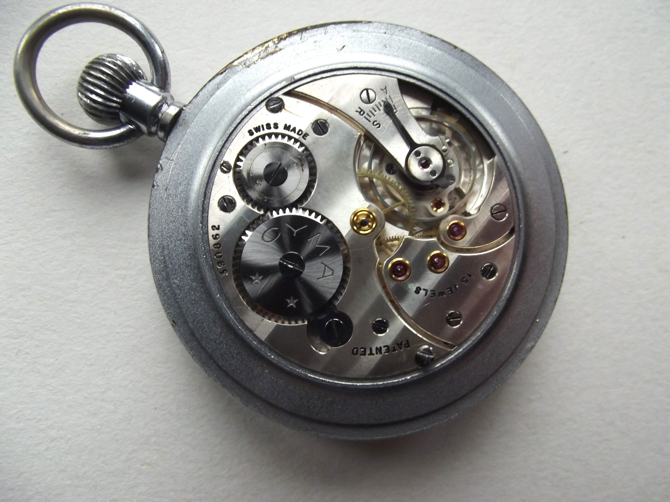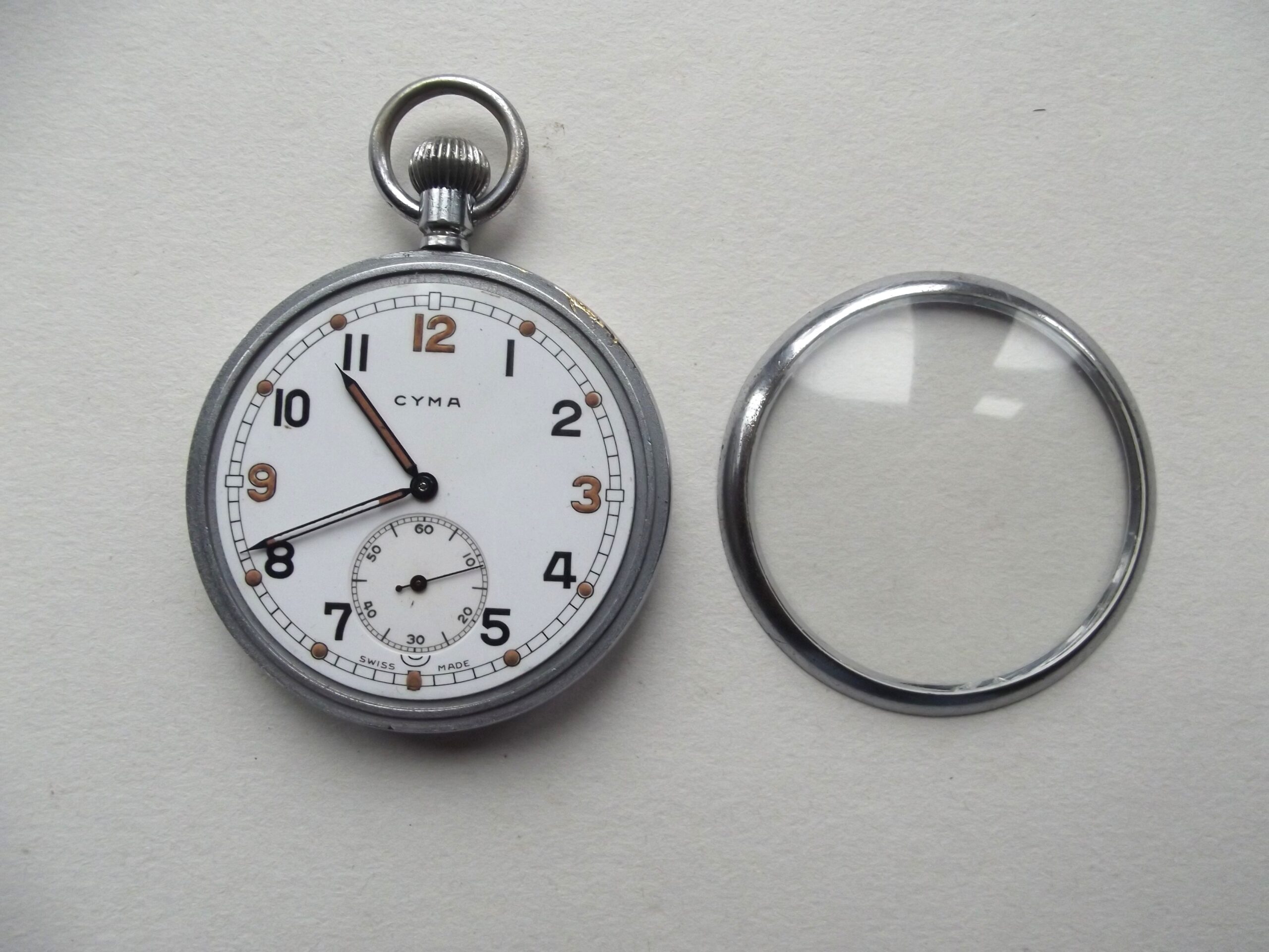 WW2 British military Cyma G.S/T.P pocketwatch in good working order. The silver nickel case is marked G.S/T.P on the back case which does show age related wear with a few small dings.
