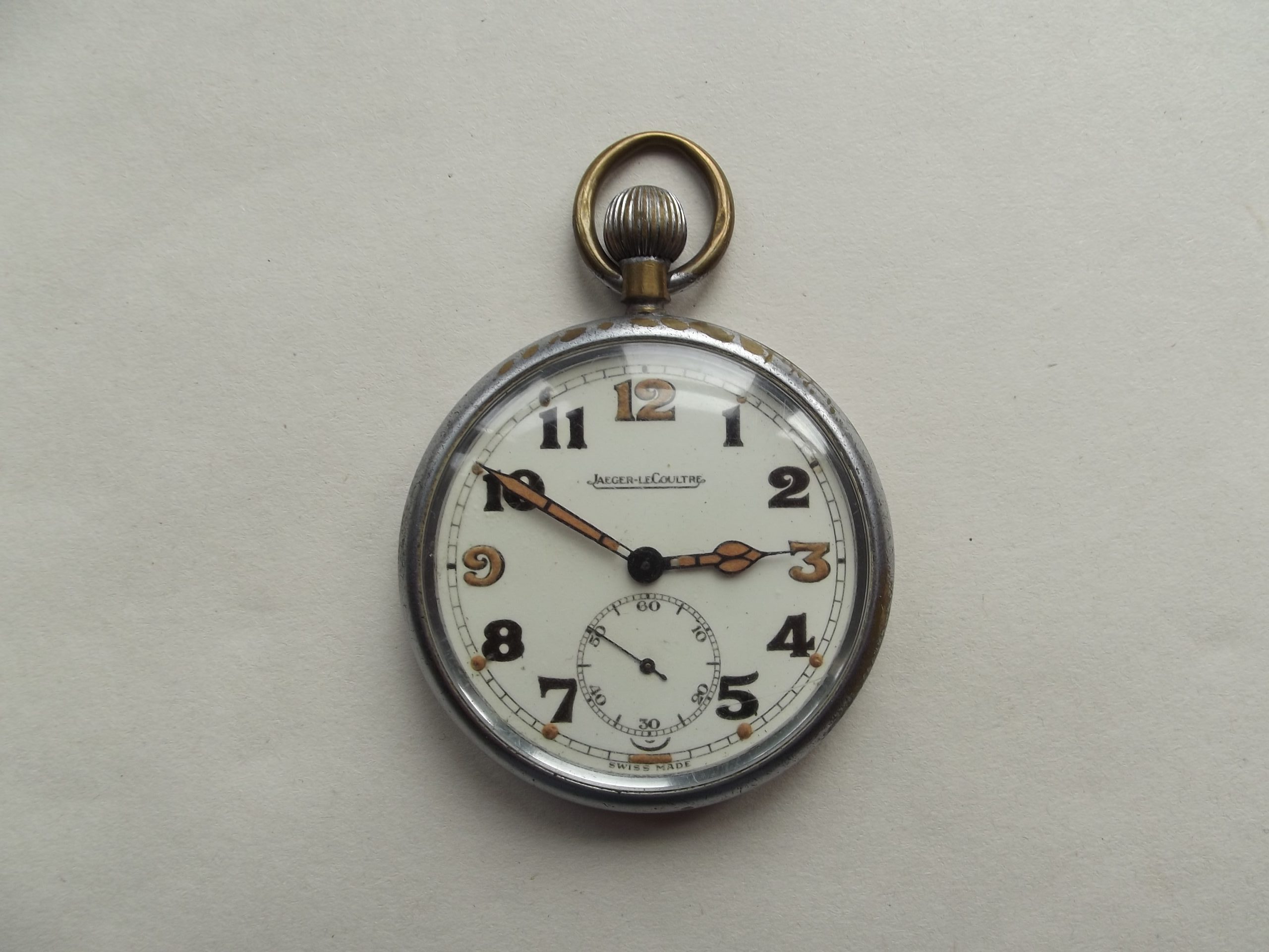 WW2 military Jaeger Lecoultre GS/TP pocketwatch in good working order, the silver nickel case is marked GS/TP arrow stamp 286296 with decommission marks .The silver nickel case is in good order with some loss of plating which is normal with this type of watch with this one being a fairly good example with most of the plating still present with some rubbing in places,the top ring is a little bit mis-shaped due to age and use this can be seen in the photographs. The movement of the watch is marked Jaeger Lecoultre and Swiss made with a calibration mark of 467/1, the watch is in good working order keeping very good time over 24 hours just gaining a minute or so with snap front and back covers.The dial of the watch and the hands still retain there original finish and are in very good condition with the dial free from any crazing or fractures in its finish,this is a very good example of this type of military watch and with the correct military marks for the period.Please see the photographs for further detail.