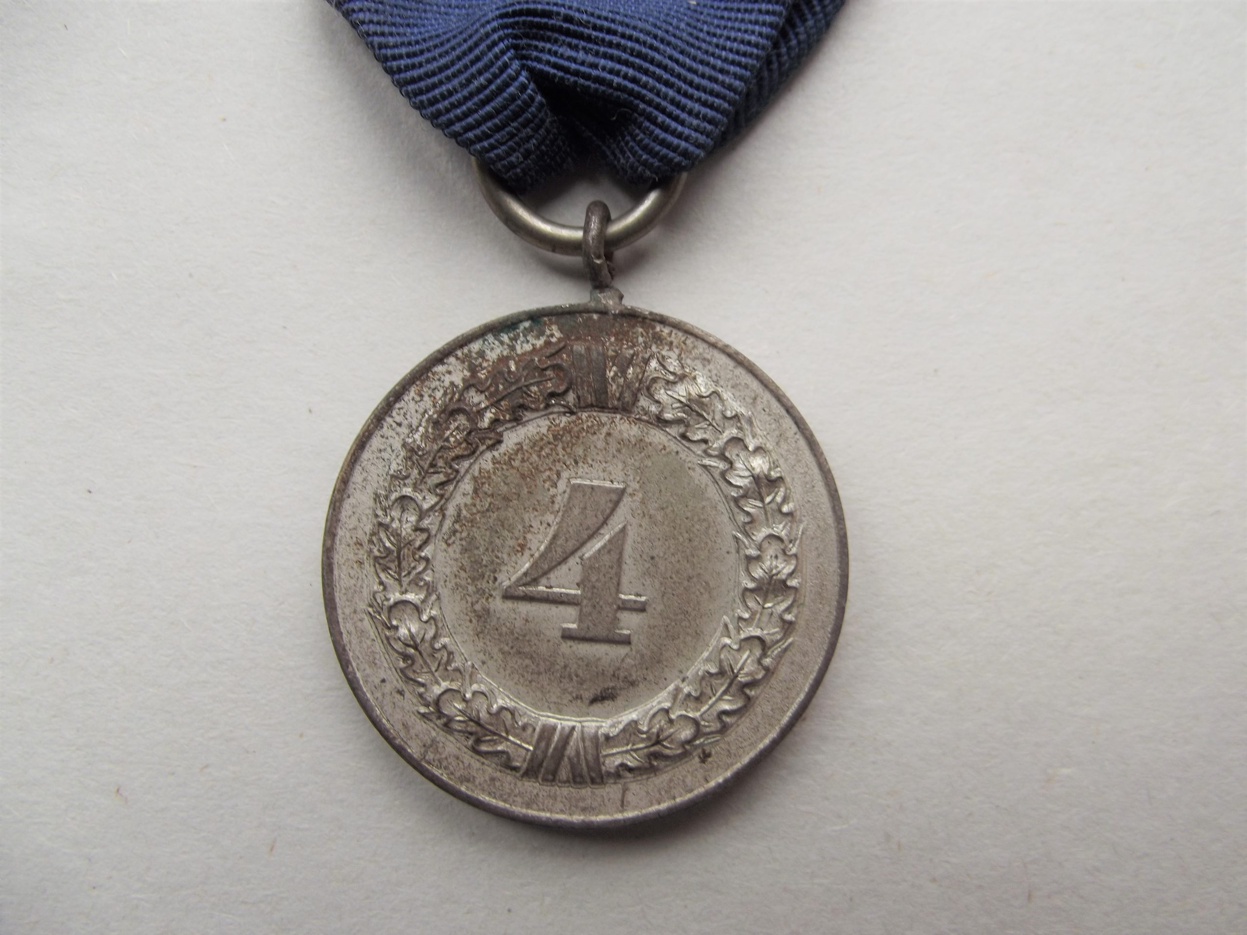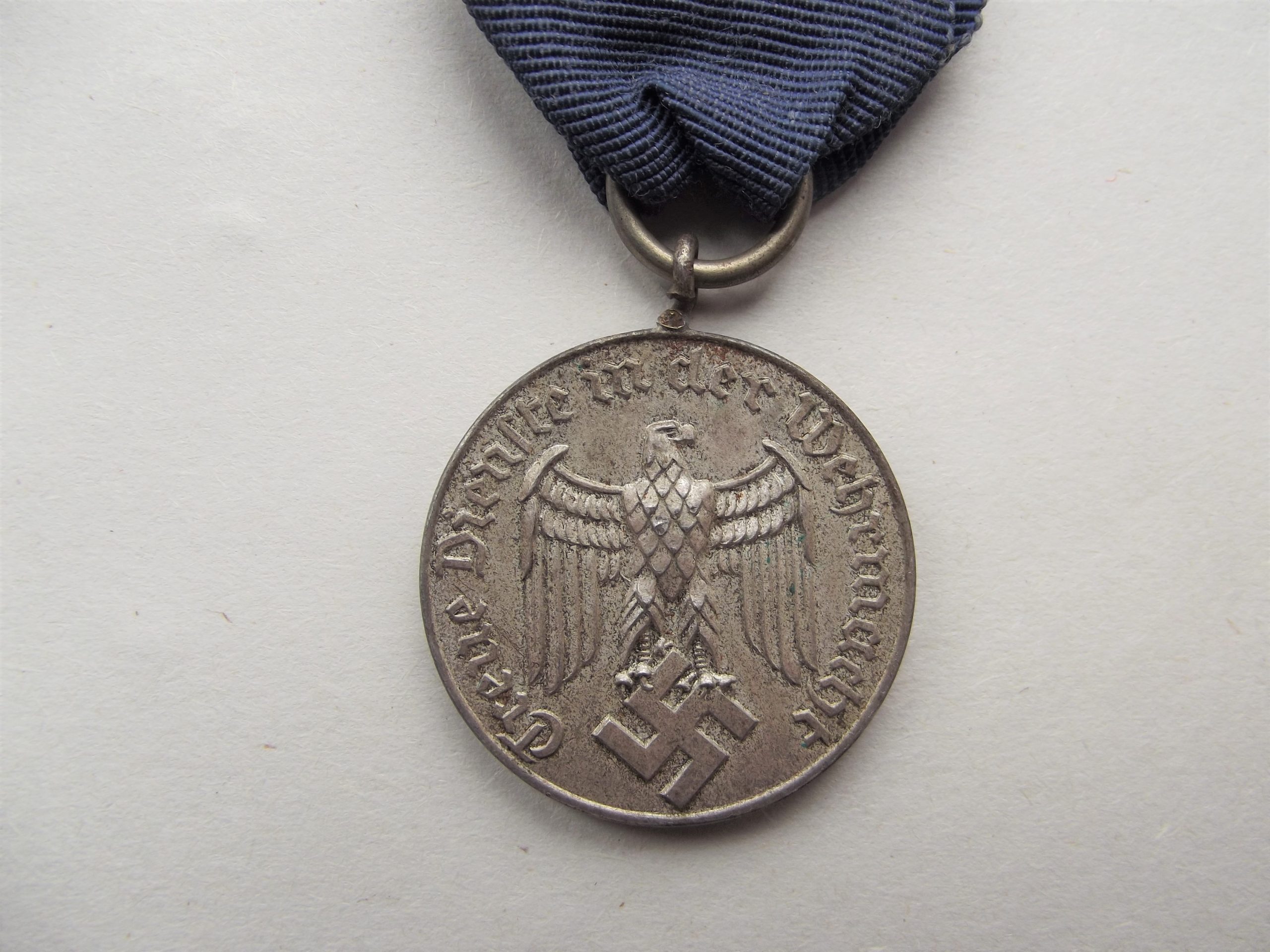 WW2 German army four-year service medal and ribbon in good used condition. The medal retains a good percentage of its silver frosting finish with good detail and age-related wear showing, please see the photographs for further details.