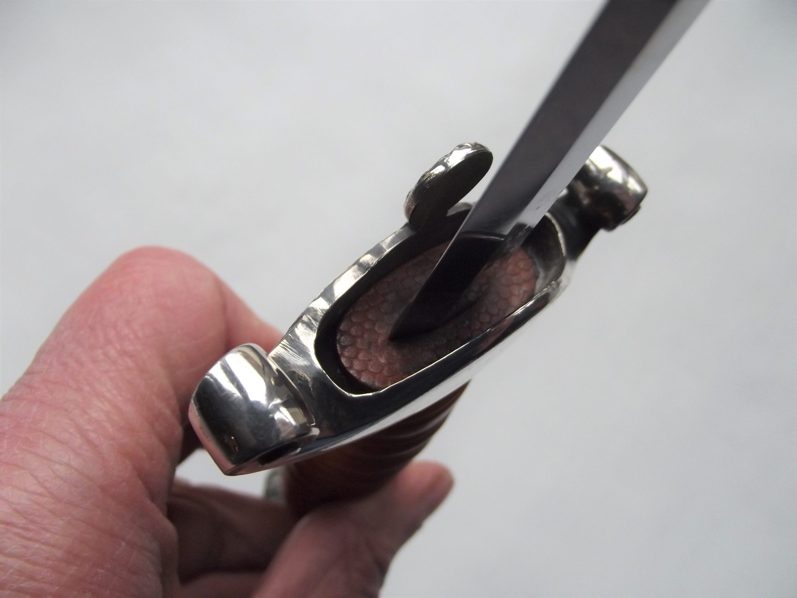 The scabbard is dent free with a little age related colour showing on the front with its two retaining screws in place.