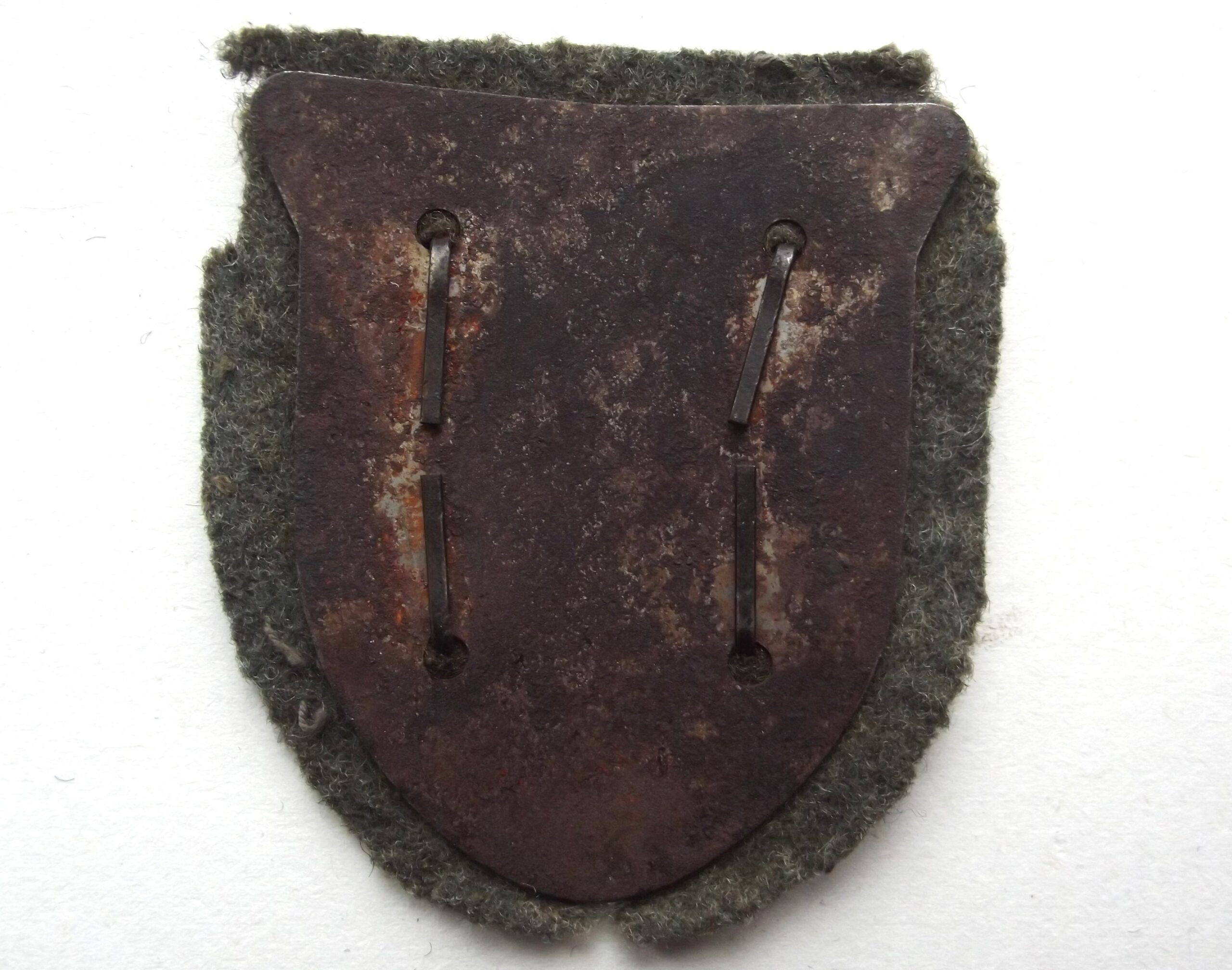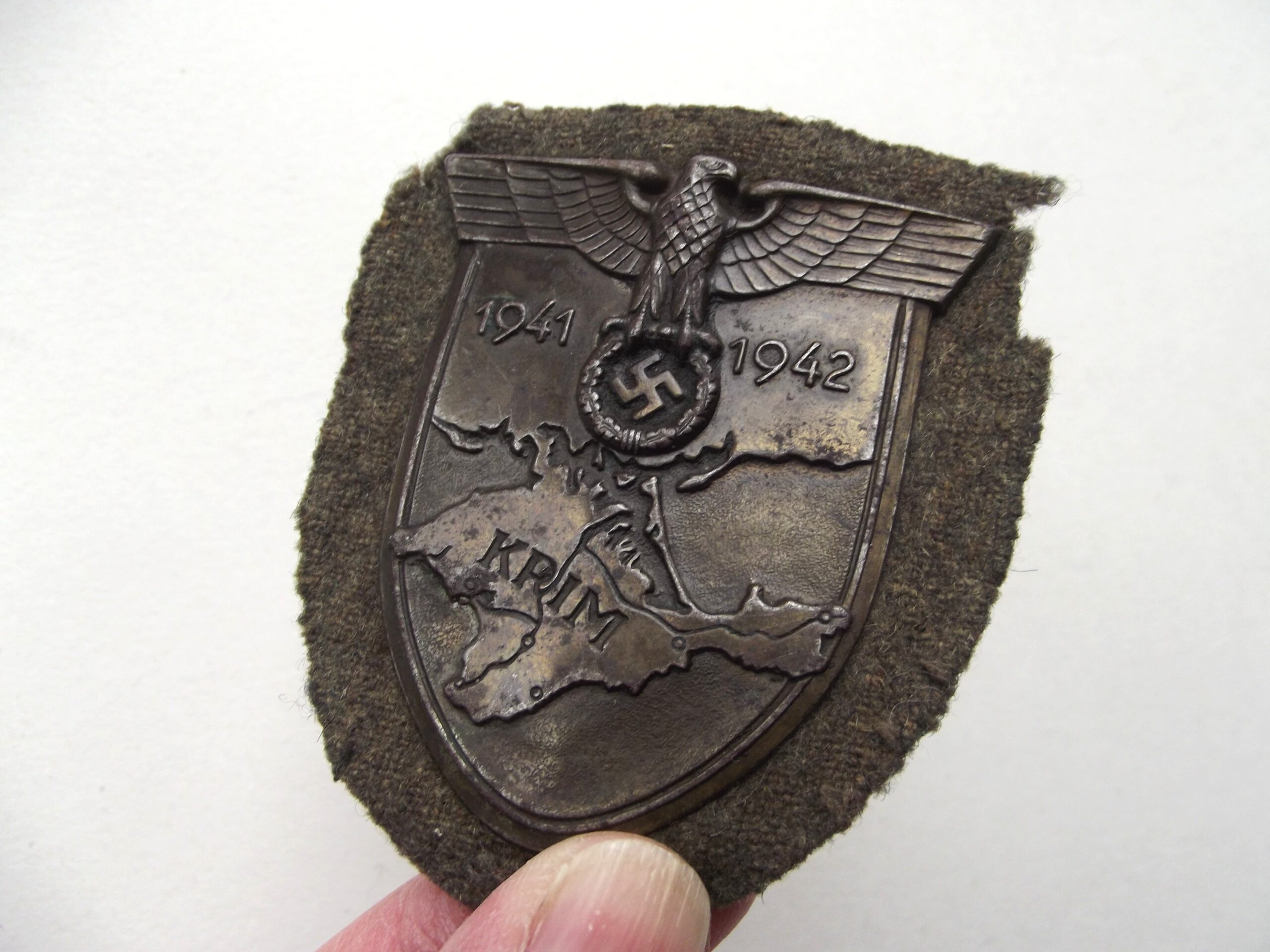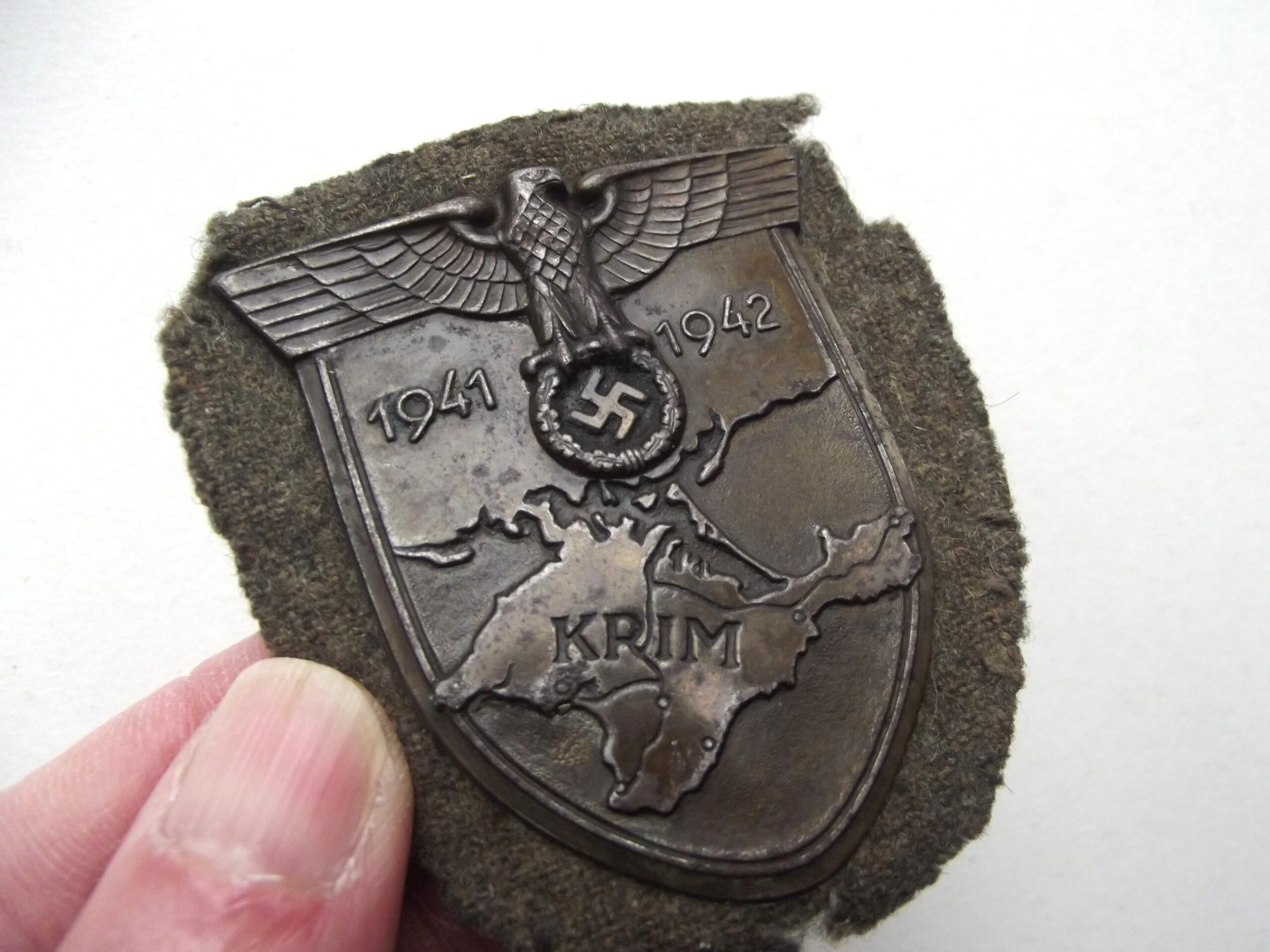 WW2 German Krim shield with backing cloth and plate in place. It is in good condition with age related wear showing.