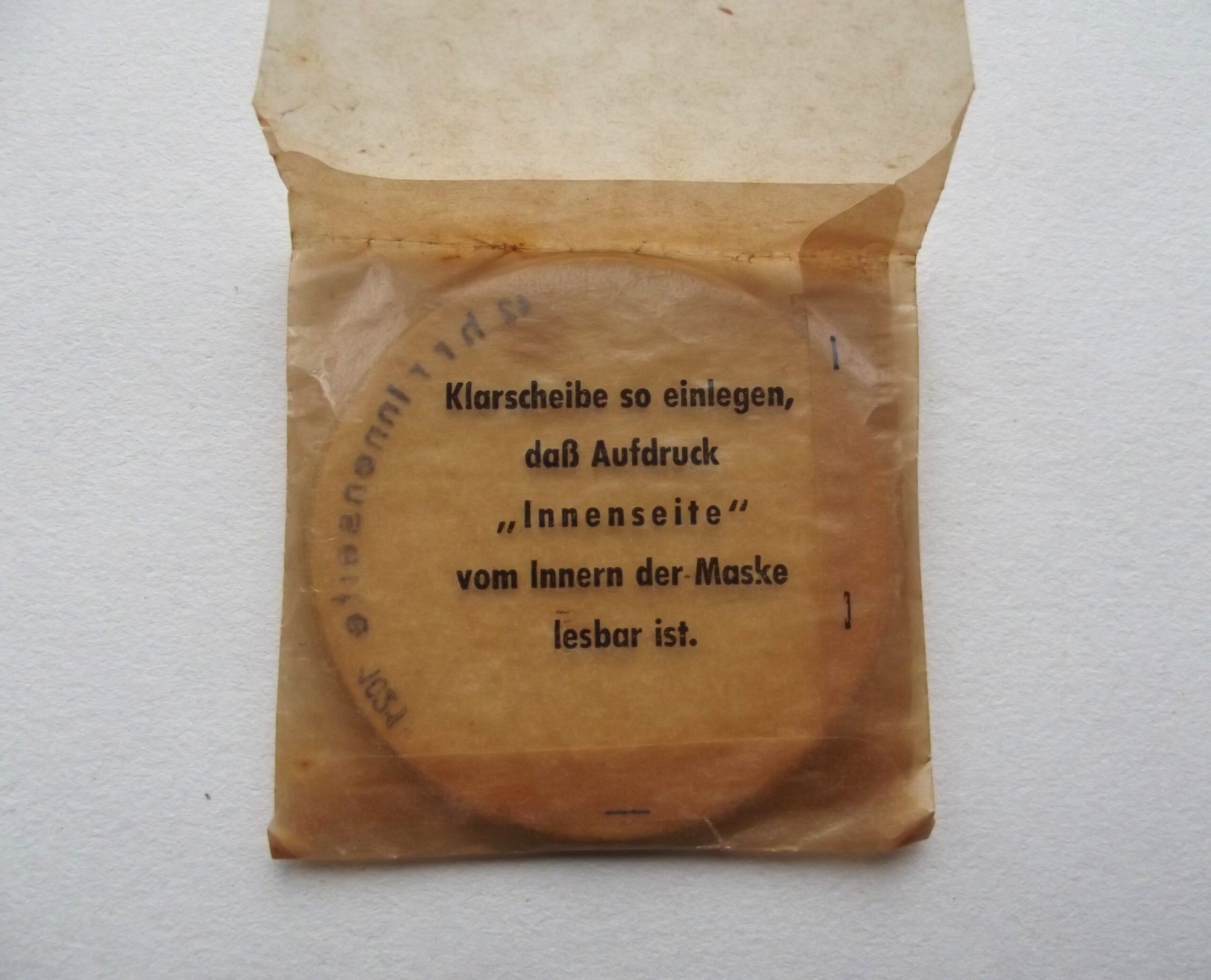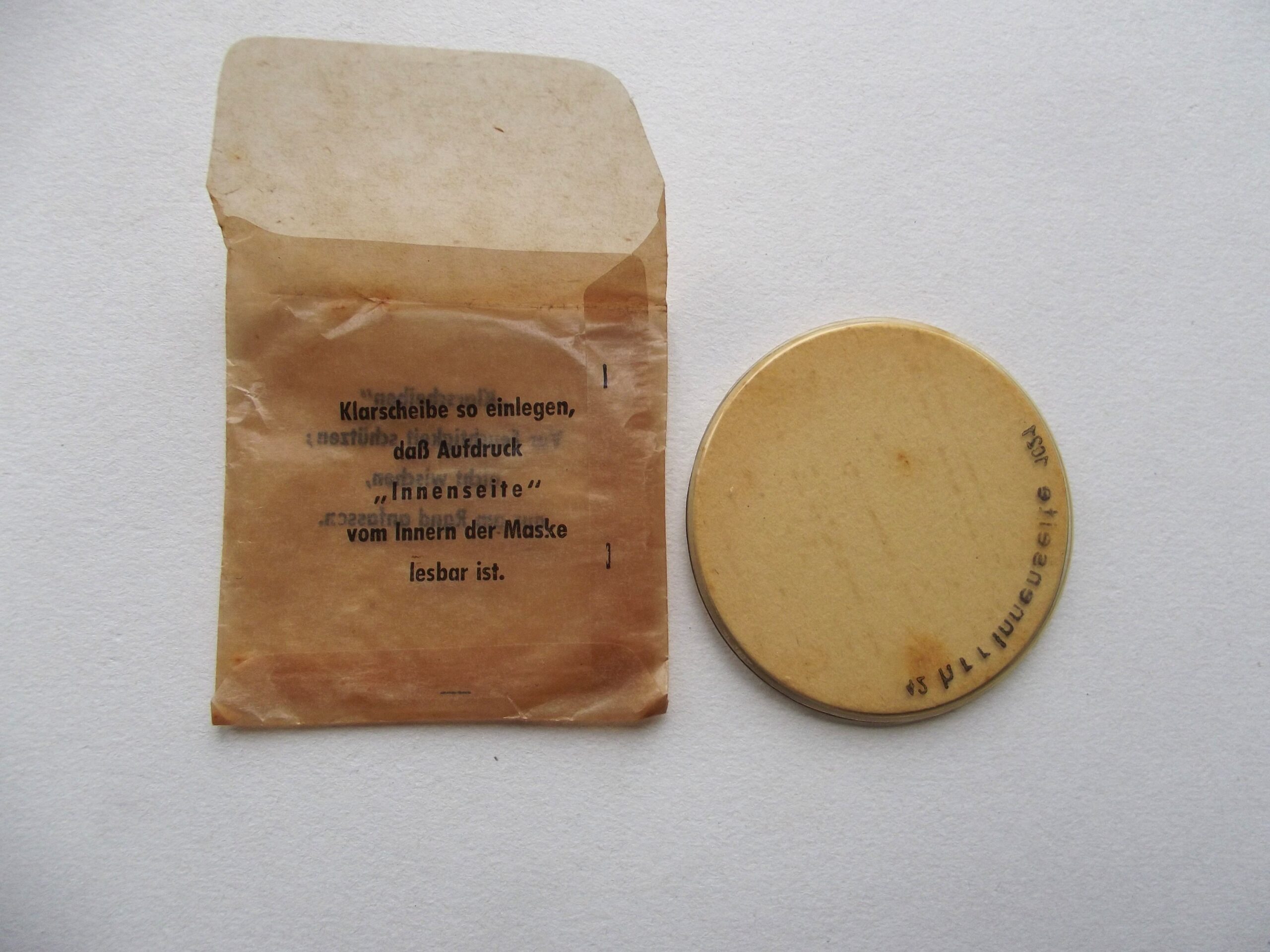 WW2 German military spare gas mask lenses in original packet. The lenses are dated 1943 in un-used condition.