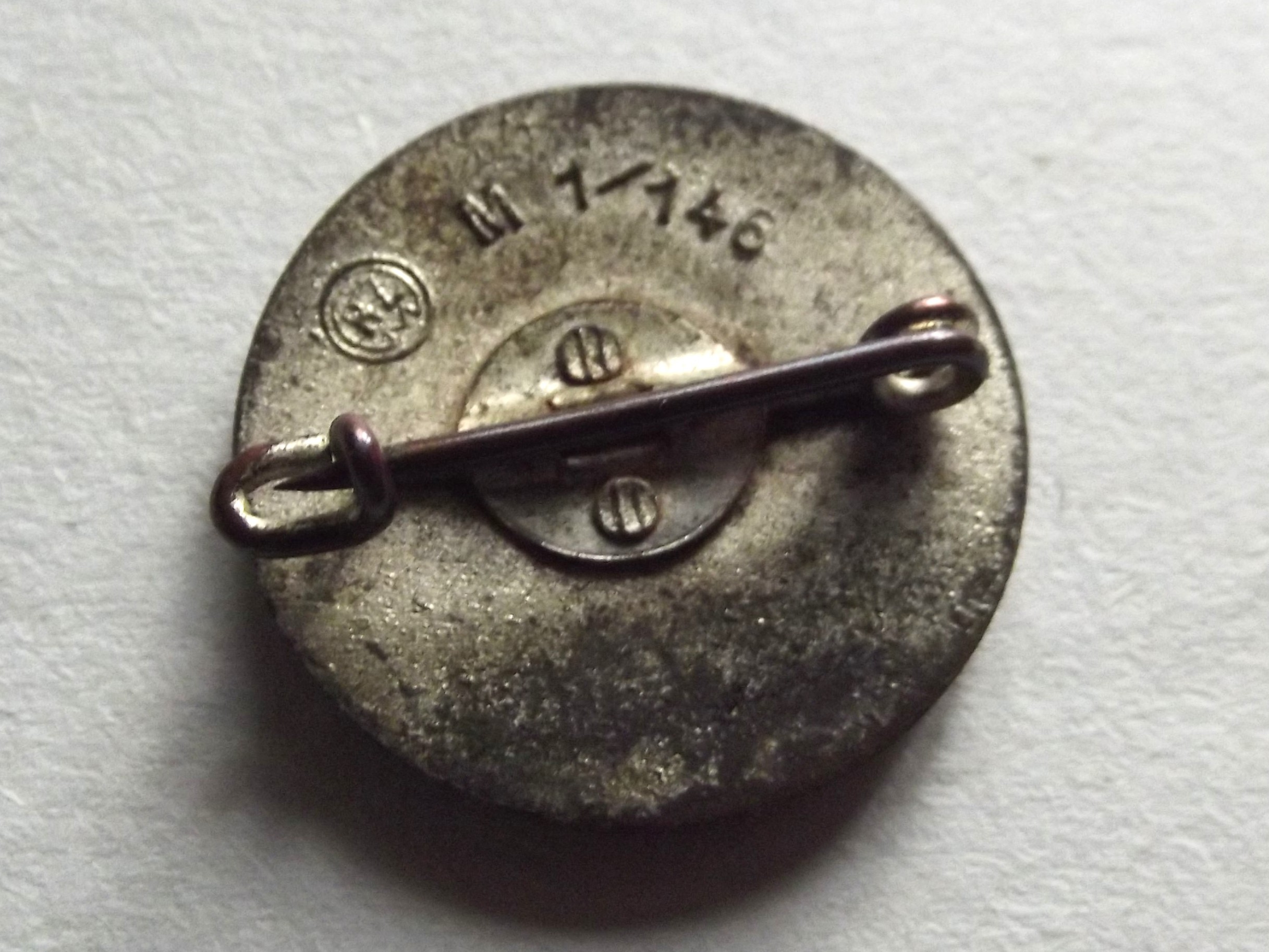 WW2 German N.S.D.A.P pin backed party badge in good used condition. The badge has the RZM mark M1/146 which is for maker is Anton Schenkls Nachf Wien. A maker not often seen.