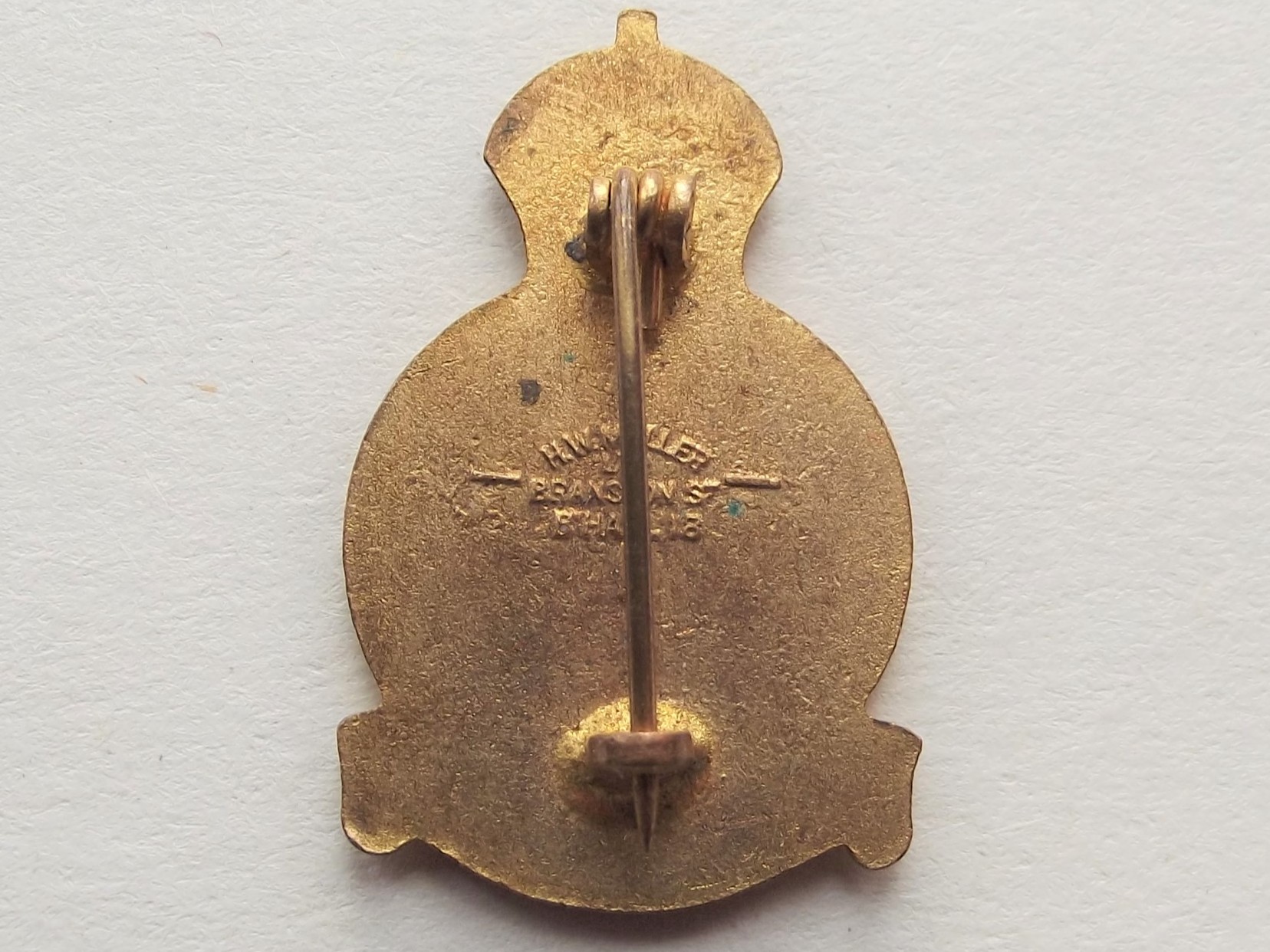 The badge has a pin fitting on the back with the makers details of H W Miller Ltd Branston St Birmingham 18.